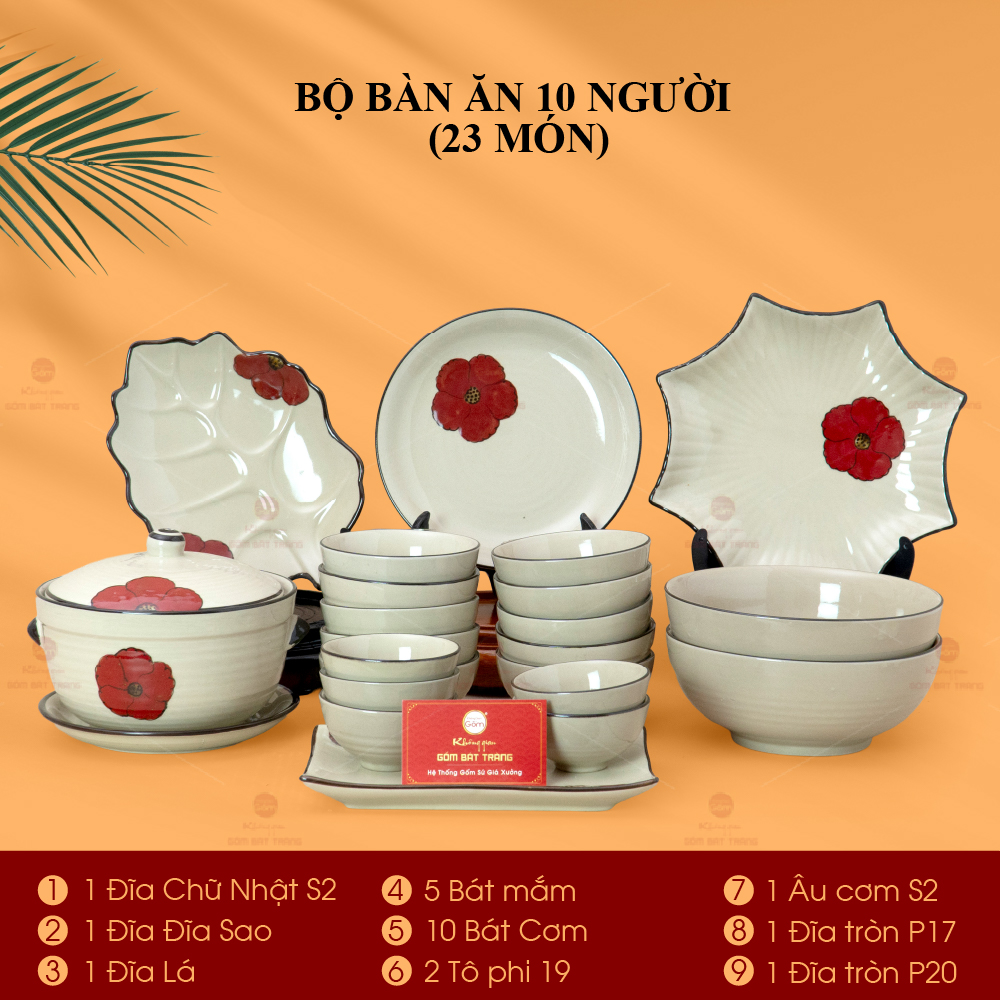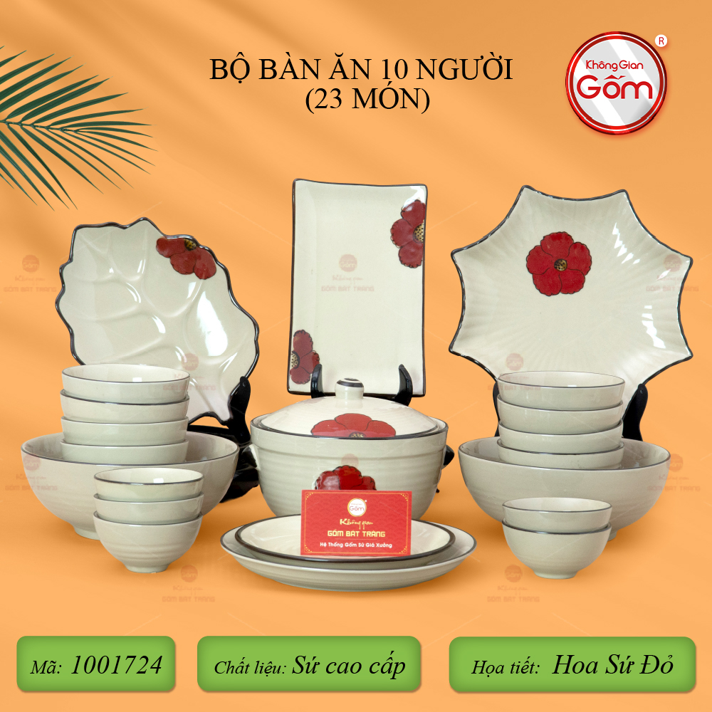 - Tên sản phẩm: Bộ Bàn Ăn 10 Người (23 món) Men Hỏa Biến Hoa Sứ Đỏ