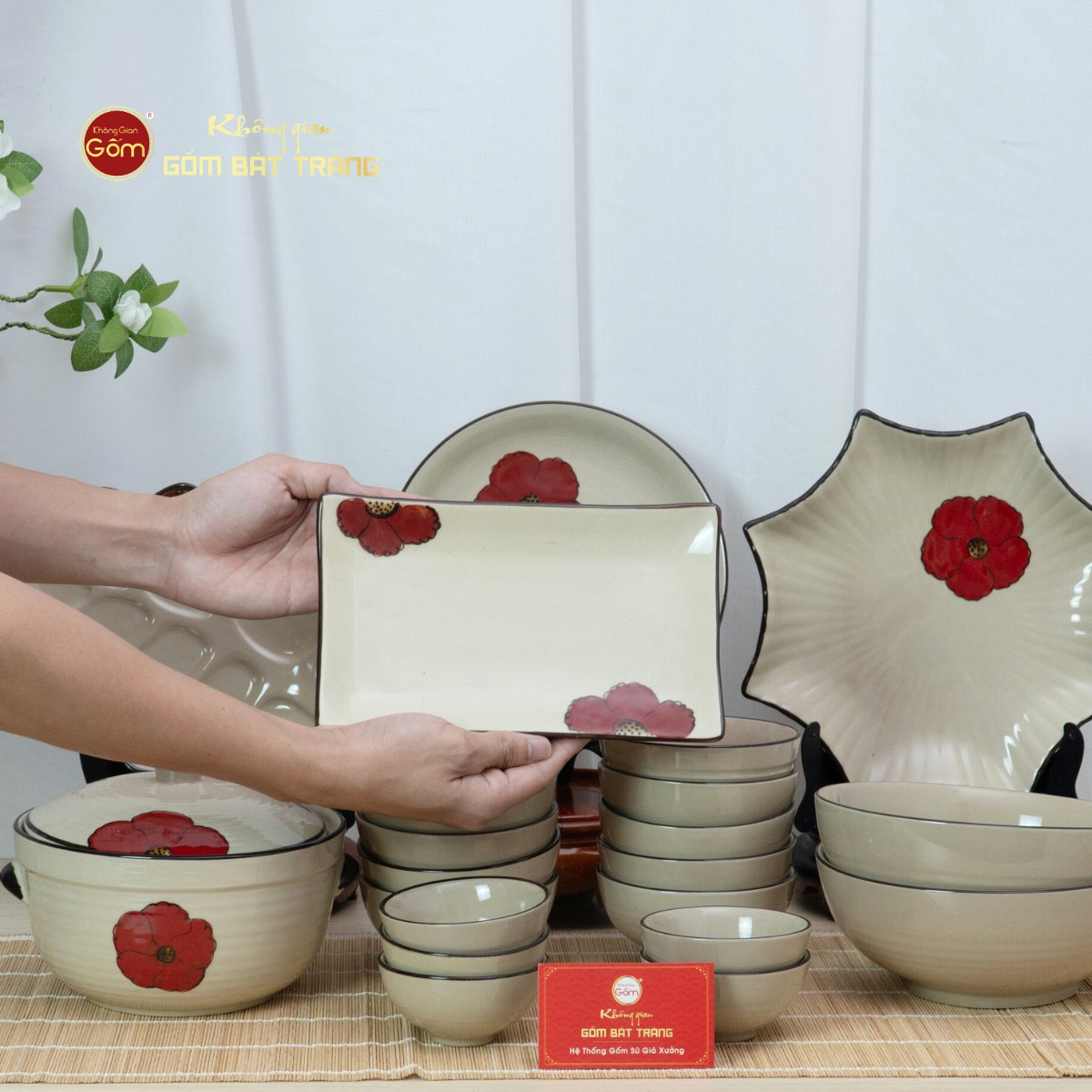 Hiện tại, Bộ Bàn Ăn 10 Người (23 món) Men Hỏa Biến Hoa Sứ Đỏ đang được phân phối với giá tại xưởng tại hệ thống showroom Không Gian Gốm Bát Tràng. Đây là địa chỉ uy tín chuyên cung cấp các sản phẩm gốm sứ cao cấp, đa dạng mẫu mã và phong cách, phù hợp với nhiều nhu cầu khác nhau. Không Gian Gốm không chỉ cam kết về chất lượng sản phẩm mà còn đồng hành cùng nhiều gia đình Việt trong việc kiến tạo không gian sống tinh tế, ấm áp. Quý khách có thể ghé trực tiếp showroom hoặc liên hệ hotline để được tư vấn chi tiết và tận tình nhất.