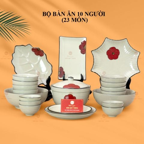 Bộ Bàn Ăn 10 Người (23 món) Men Hỏa Biến Hoa Sứ Đỏ