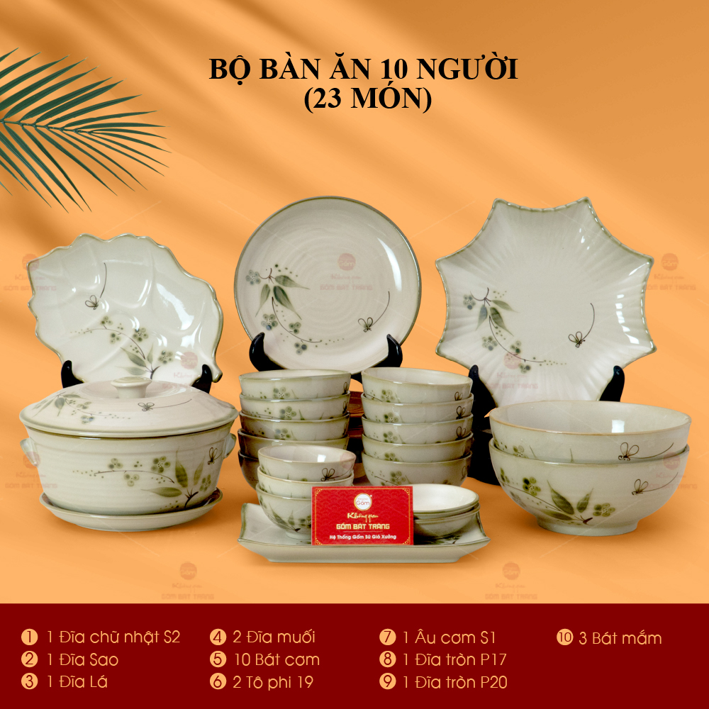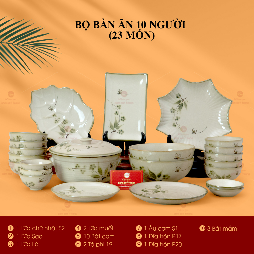 - Số lượng: 10 bát cơm, 2 tô phi 19, 1 đĩa phi 17, 1 đĩa phi 20, 2 đĩa muối, 3 bát mắm, 1 âu cơm, 1 đĩa sao, 1 đĩa chữ nhật, 1 đĩa lá