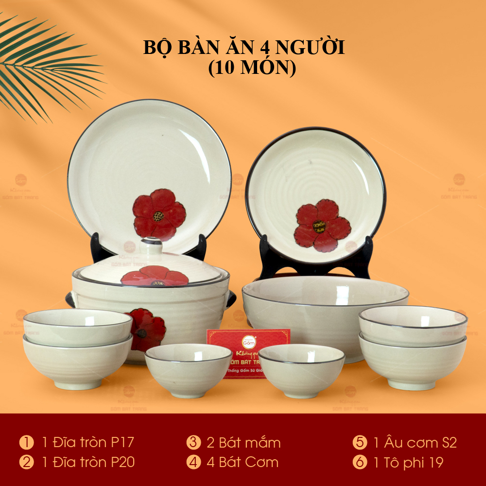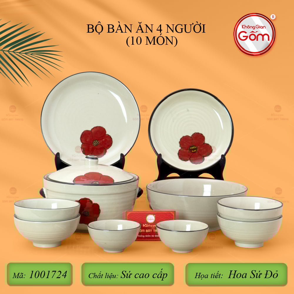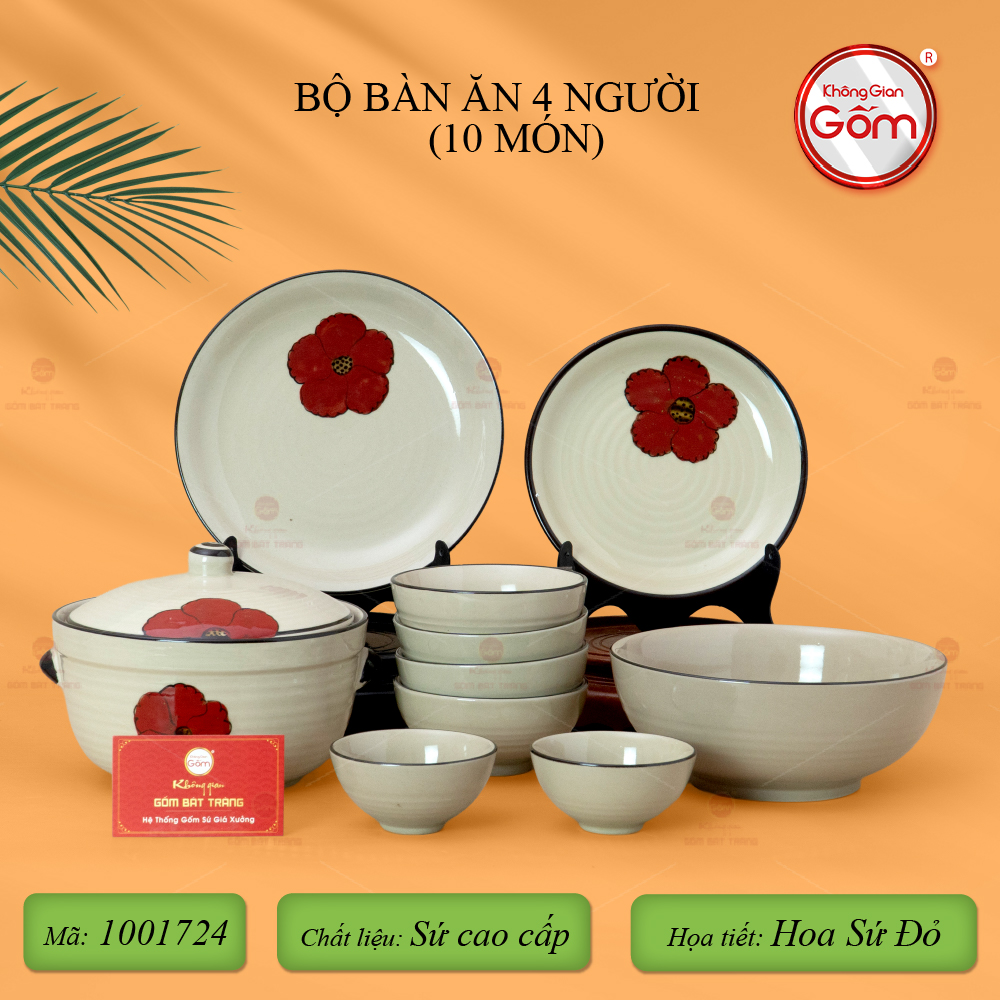 - Tên sản phẩm: Bộ Bàn Ăn 4 Người (10 món) Men Hỏa Biến Hoa Sứ Đỏ