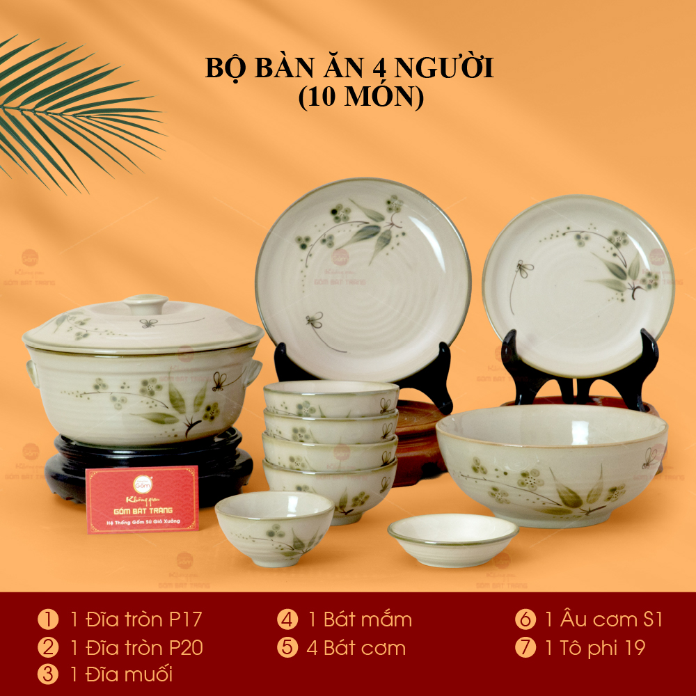 - Số lượng: 4 bát cơm, 1 tô phi 19, 1 đĩa phi 17, 1 đĩa phi 20, 1 đĩa muối, 1 bát mắm, 1 âu cơm