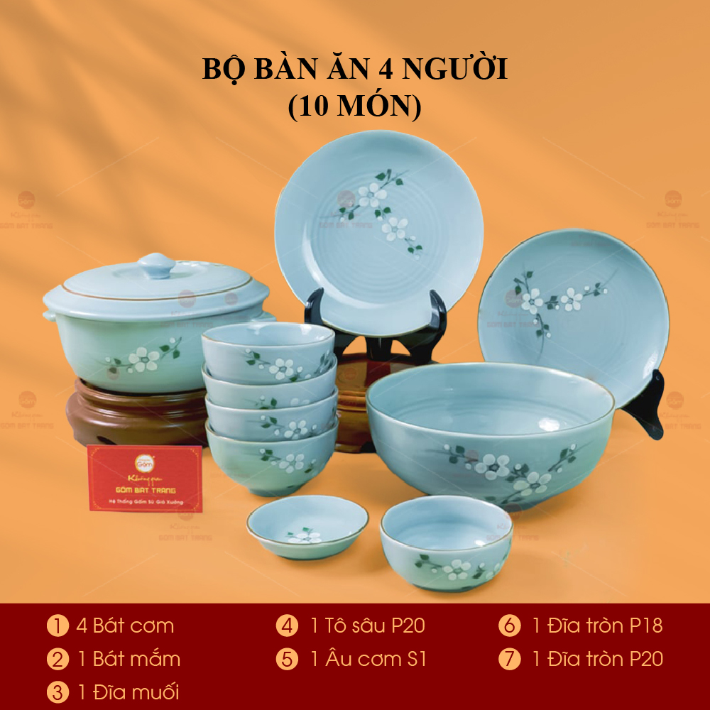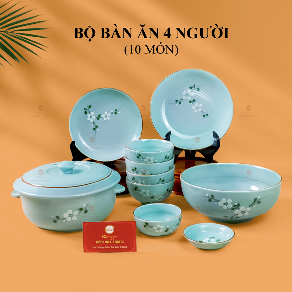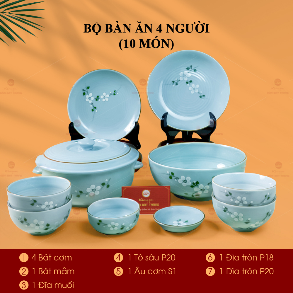 Xem thêm: Bộ Bàn Ăn 10 Người (23 món) Men Ngọc Hoa Đào Trắng | Bộ Bàn Ăn 4 Người (10 món) Men Ngọc Hoa Đào Trắng | Bộ Bàn Ăn 4 Người (10 món) Men Xanh Ngọc Vẽ Bèo