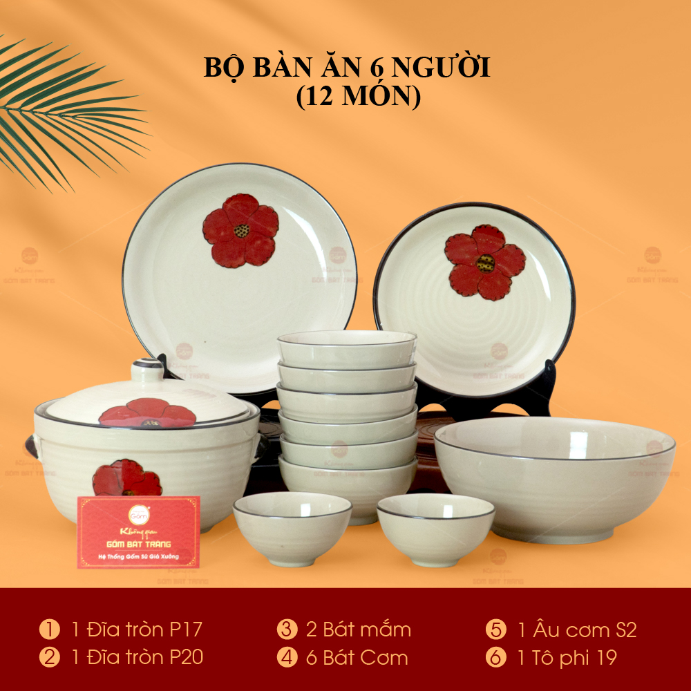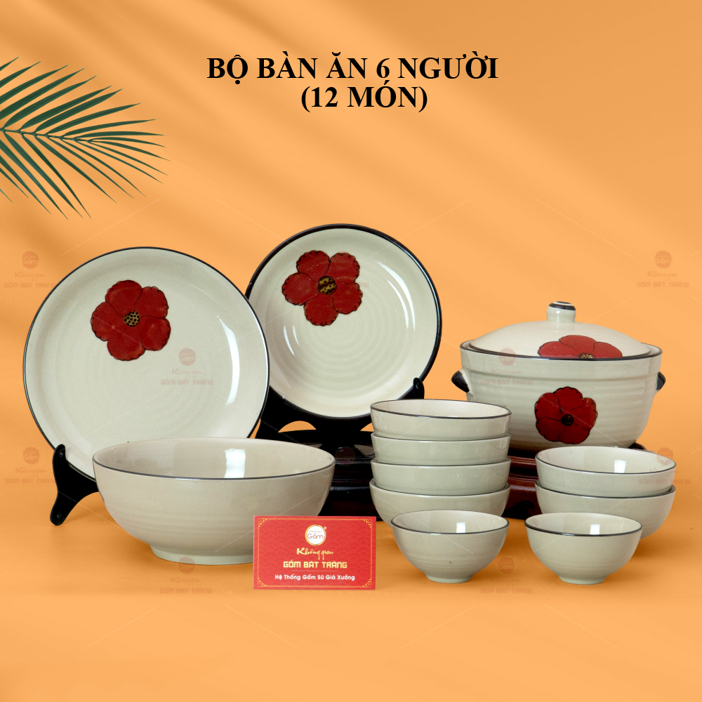 - Tên sản phẩm: Bộ Bàn Ăn 6 Người (12 món) Men Hoả Biến Hoa Sứ Đỏ
