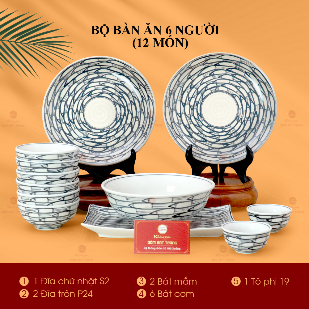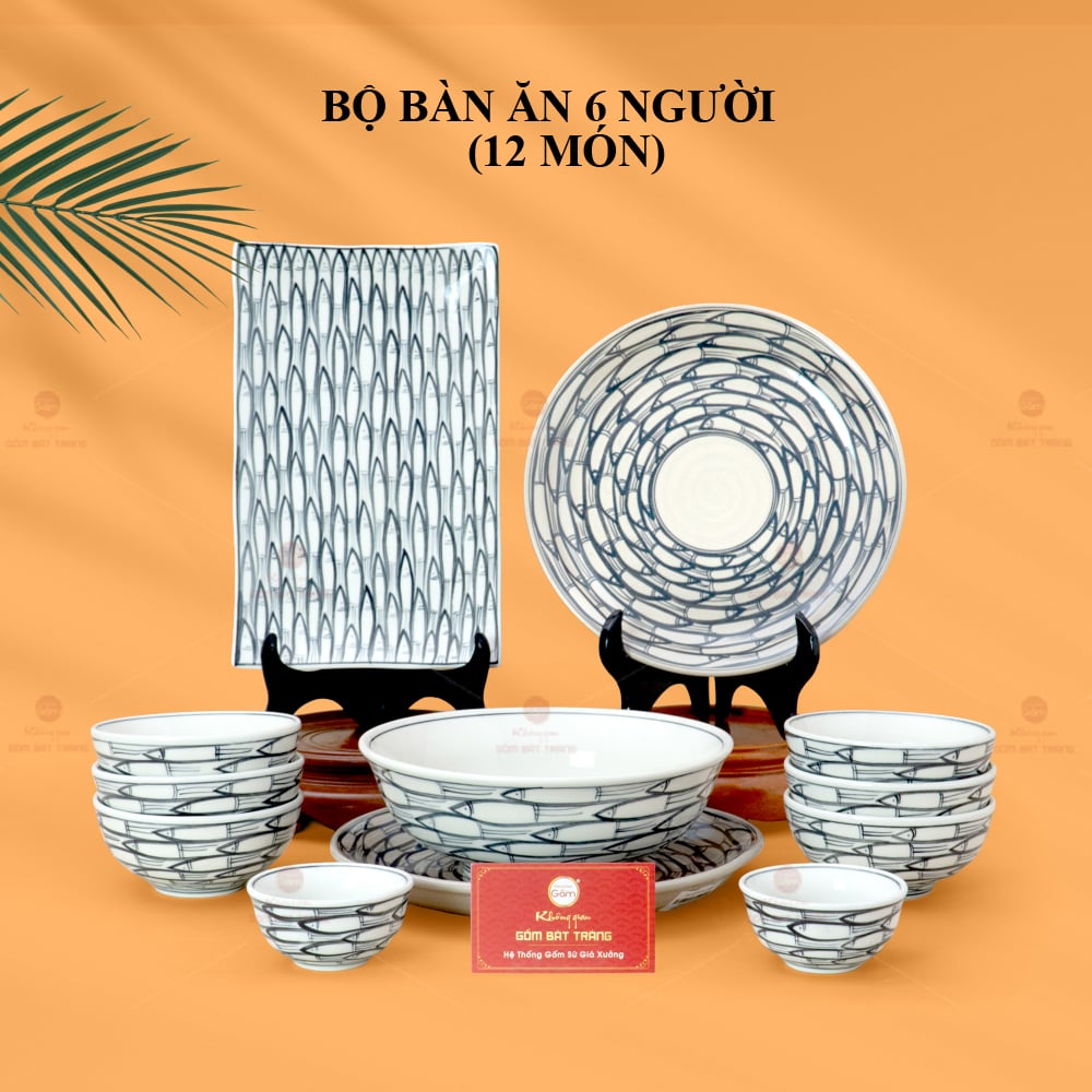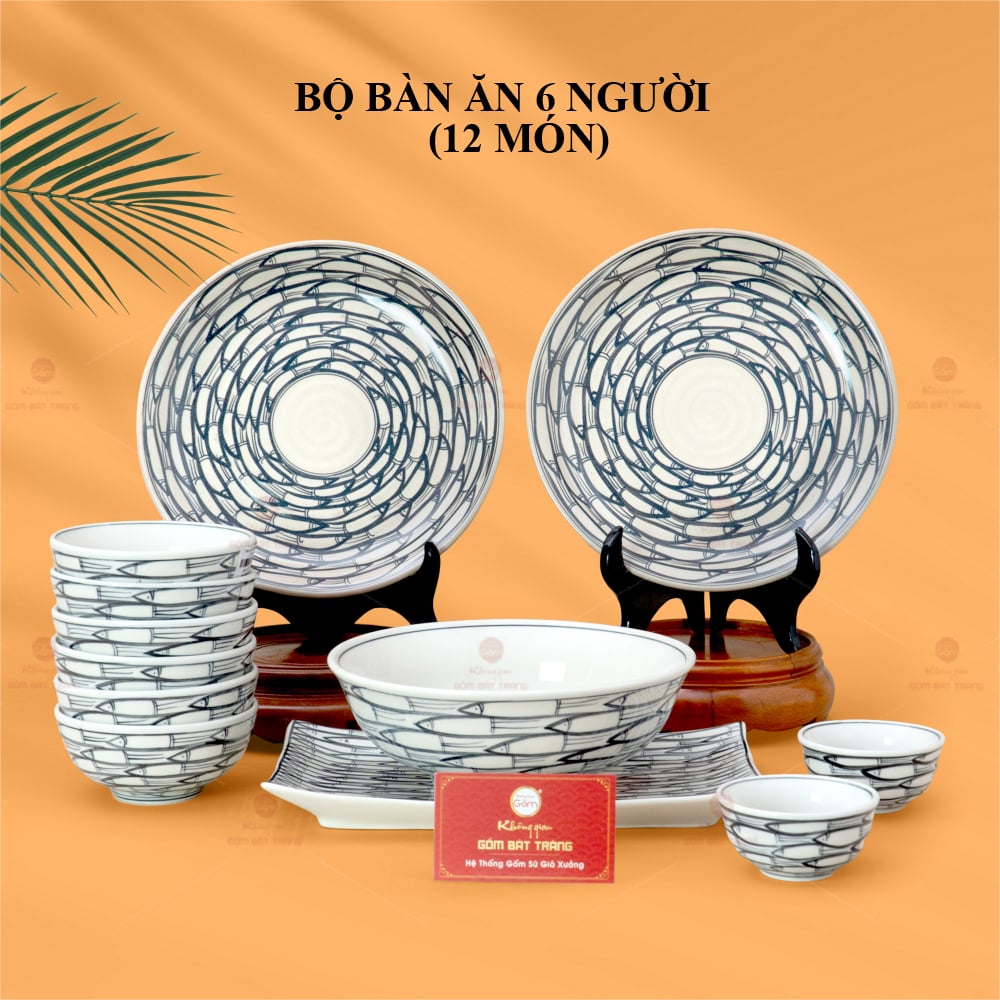 - Tên sản phẩm: Bộ Bàn Ăn 6 Người (12 món) Men Trắng Vẽ Cá Đàn