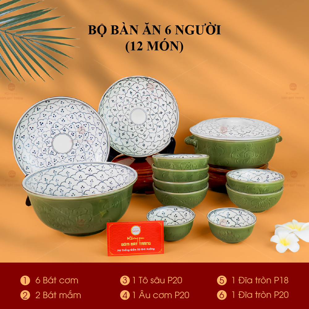 - Tên sản phẩm: Bộ Bàn Ăn 6 Người (12 món) Men Xanh Ngọc Vẽ Bèo