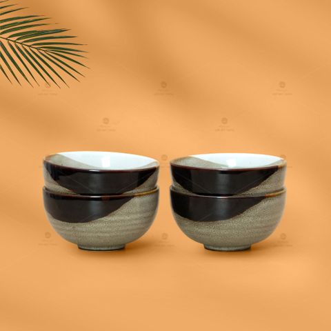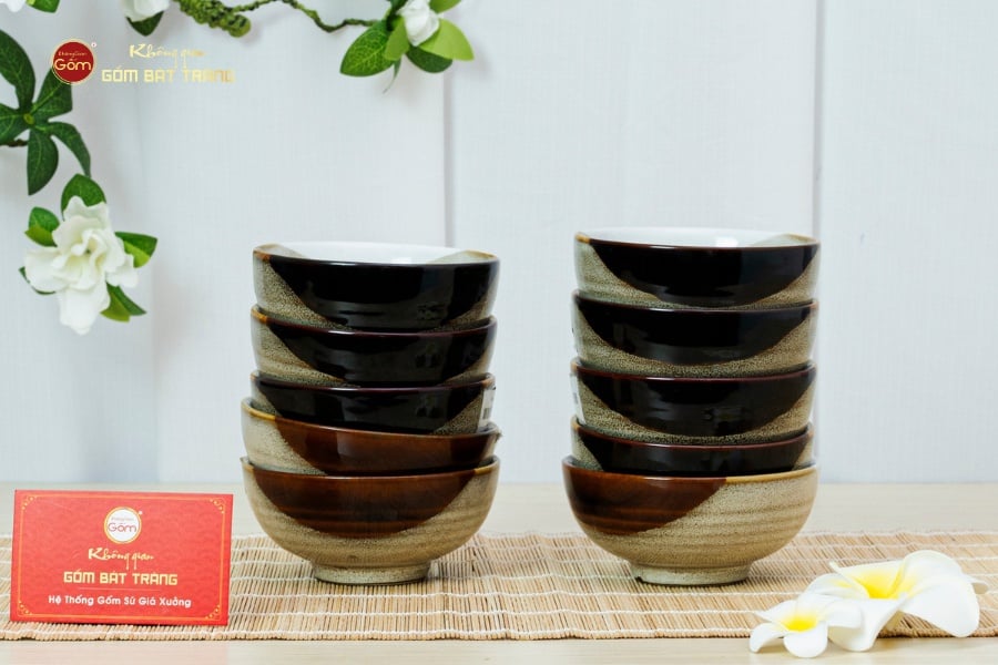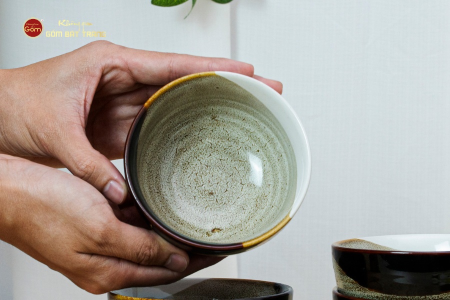 Hiệu ứng ba màu độc đáo: Bộ sản phẩm gây ấn tượng với lớp men ba màu hòa quyện: sự trầm ấm của nâu đất, sự thanh khiết của trắng ngà và sự sâu lắng của xanh lam. Các mảng màu được phủ thủ công, tạo nên sự loang chảy tự nhiên, mỗi bát đều mang sắc thái riêng, không trùng lặp, thể hiện cá tính nghệ thuật độc bản.