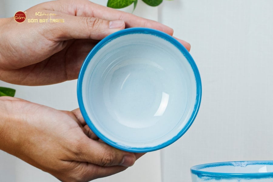 Điểm nhấn đặc biệt của bộ sản phẩm chính là lớp men Biển Xanh Cát Trắng – dòng men độc đáo được phủ thủ công, tạo nên hiệu ứng loang tự nhiên không hề trùng lặp. Sắc xanh sâu lắng gợi hình ảnh đại dương mênh mông, trong khi sắc trắng tinh khôi lại mang đến cảm giác thanh khiết, yên bình. Sự hòa quyện uyển chuyển của hai gam màu này khiến mỗi chiếc bát trong bộ đều là một bản thể độc đáo, giàu giá trị thẩm mỹ.