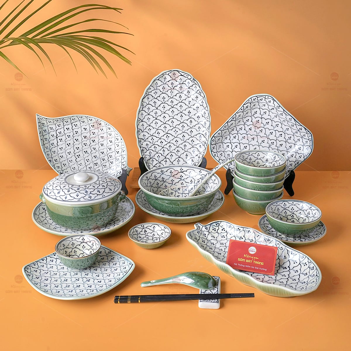 Bộ Bát Đĩa Bát Tràng Men Xanh Ngọc Vẽ Bèo