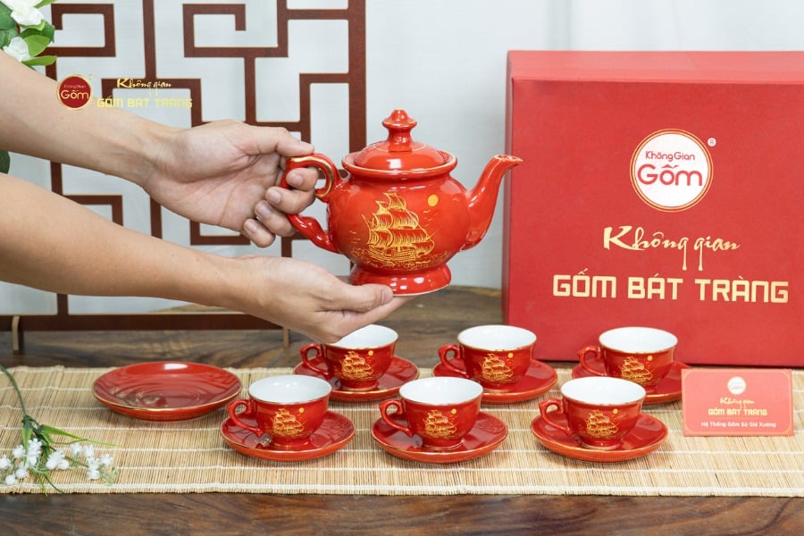 Bộ ấm chén Men Đỏ Đài Các Thuận Buồm Vẽ Vàng được phân phối tại các cửa hàng Không Gian Gốm Bát Tràng. Quý khách hàng cũng có thể tham khảo và chọn mua các mẫu ấm chén khác tại các showroom của hệ thống. Chúng tôi chuyên nhận thực hiện các đơn hàng với số lượng lớn như quà tặng doanh nghiệp và quà dành cho nhân viên, đồng thời cung cấp dịch vụ in logo/khắc chữ theo yêu cầu.