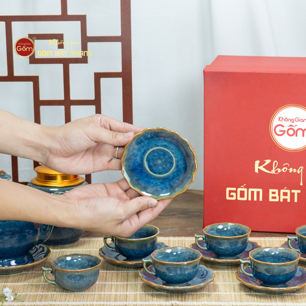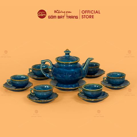 Bộ Trà Men Hỏa Biến Xanh Đài Các mang phong cách cổ điển, quý phái, với kiểu dáng ấm chén "Đài Các" sang trọng, thanh thoát. Đặc biệt, bộ trà được bao phủ bởi sắc men Hỏa Biến Xanh độc đáo, với các vân men biến ảo không trùng lặp, tạo nên vẻ đẹp riêng biệt cho từng sản phẩm. Bộ ấm chén được chế tác thủ công với đôi tay điêu luyện của người thợ gốm Bát Tràng, thông qua kỹ thuật nung Hỏa Biến đặc trưng. Màu xanh men hỏa biến trầm lắng, huyền ảo, tạo nên vẻ đẹp sang trọng và ấn tượng mạnh mẽ. Khách hàng có thể chọn mua bộ sản phẩm để sử dụng hàng ngày, tiếp khách vào những dịp quan trọng hoặc làm quà tặng kèm hộp đựng.