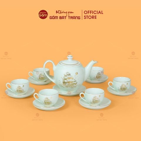 Bộ Trà Men Trắng Dáng Minh Long Thuận Buồm Xuôi Gió Vẽ Vàng