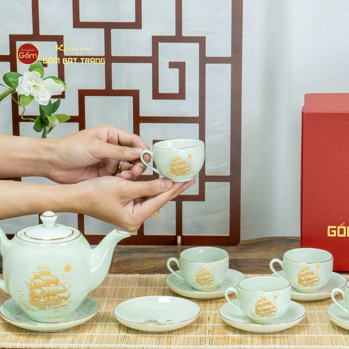 Mỗi chi tiết trong bộ trà đều được chế tác đồng bộ, từ màu men, dáng ấm chén cho đến họa tiết vẽ vàng. Sự đồng bộ này mang lại sự cân đối, trang nhã khi bày biện. Họa tiết Thuận Buồm Xuôi Gió không chỉ đẹp về mặt thị giác mà còn có ý nghĩa phong thủy sâu sắc, tượng trưng cho sự may mắn, suôn sẻ trong công việc, kinh doanh và cuộc sống. Đây là lời chúc tốt lành cho mọi dự định, mong muốn mọi việc đều tiến triển trôi chảy, như con thuyền thuận gió ra khơi.