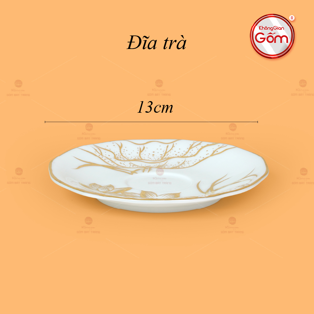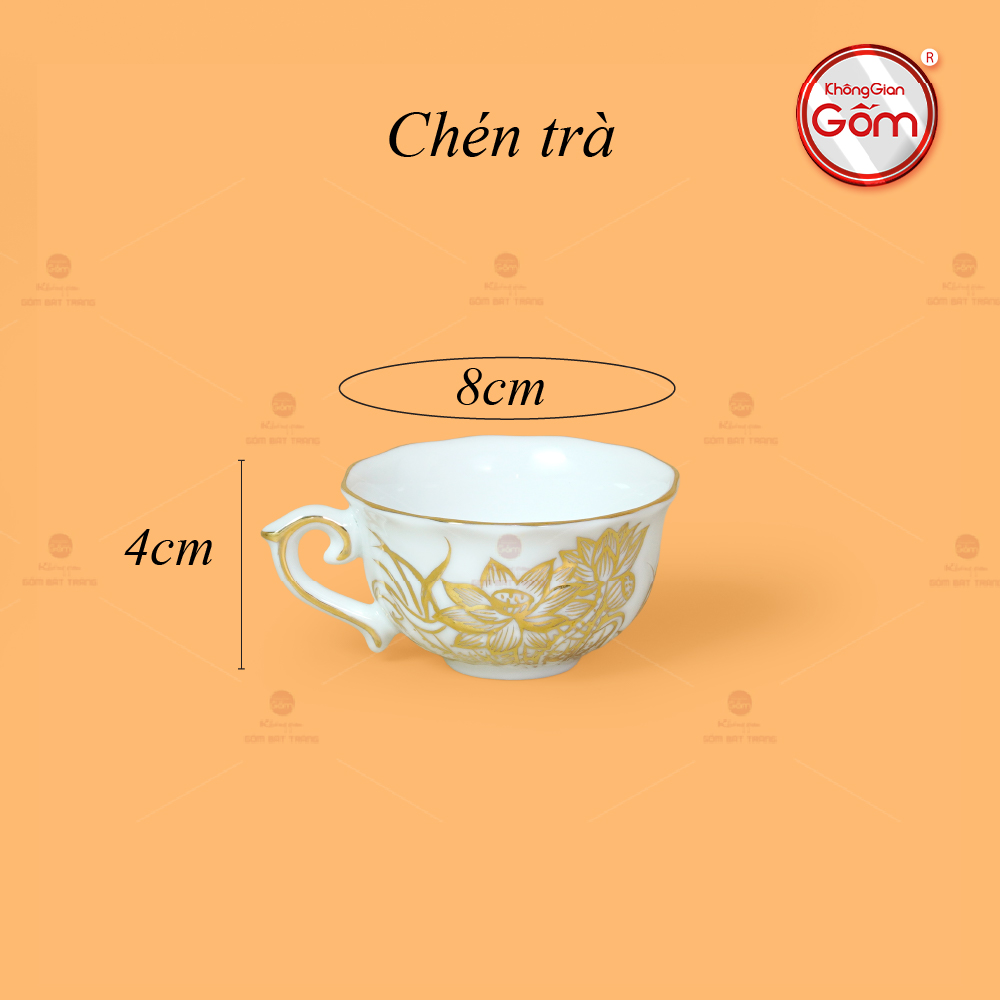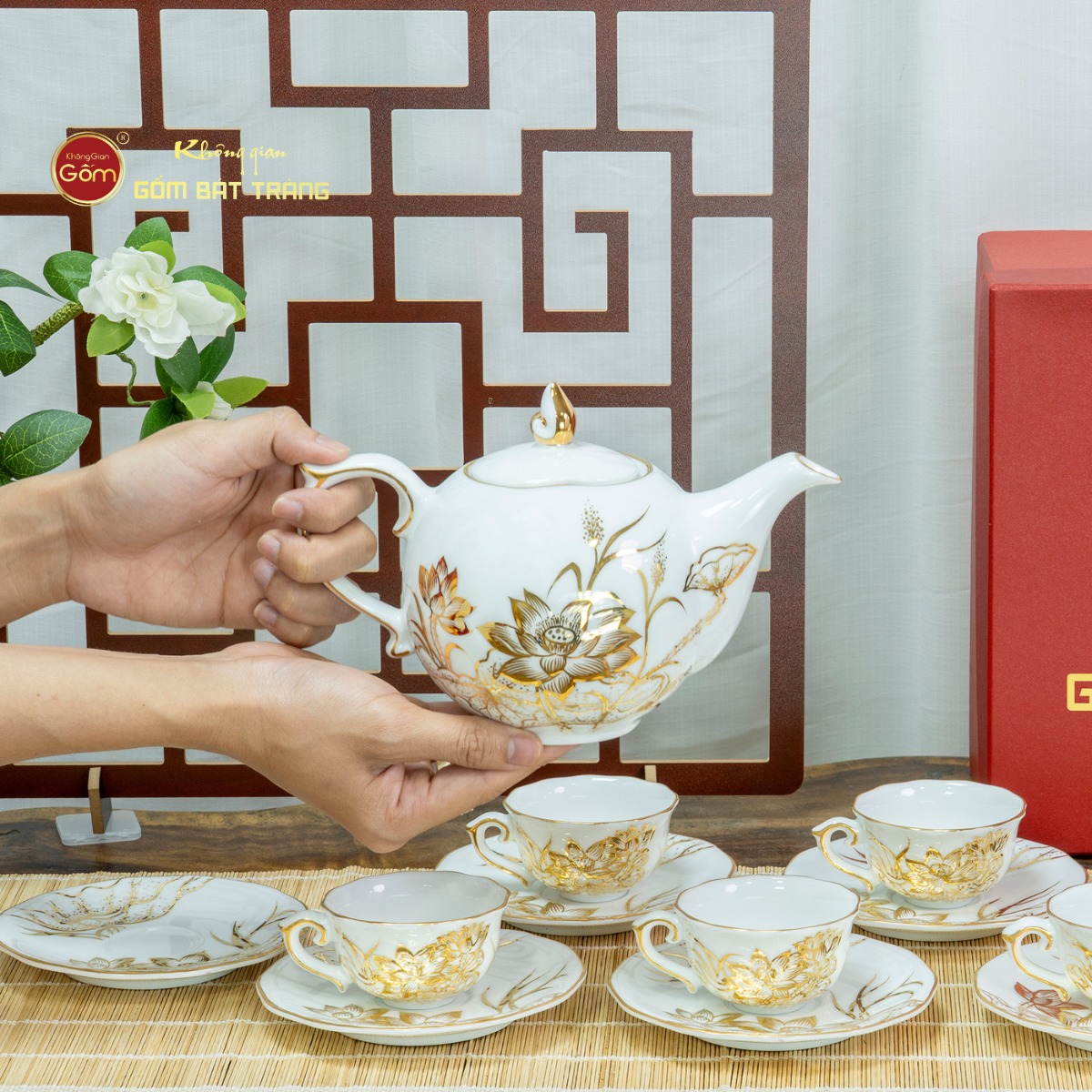Chất men trắng phối cùng ánh vàng kim tạo nên cảm giác sang trọng nhưng không phô trương, tôn vinh nét đẹp truyền thống trong hơi thở hiện đại. Bộ Trà Men Trắng Mẫu Đơn Hoa Sen Vẽ Vàng gồm 1 ấm trà, 6 chén, 6 đĩa kê và 1 đĩa lót ấm. Mỗi chi tiết đều được chế tác tỉ mỉ, cân xứng về kích thước, vừa vặn cho bàn trà Việt.