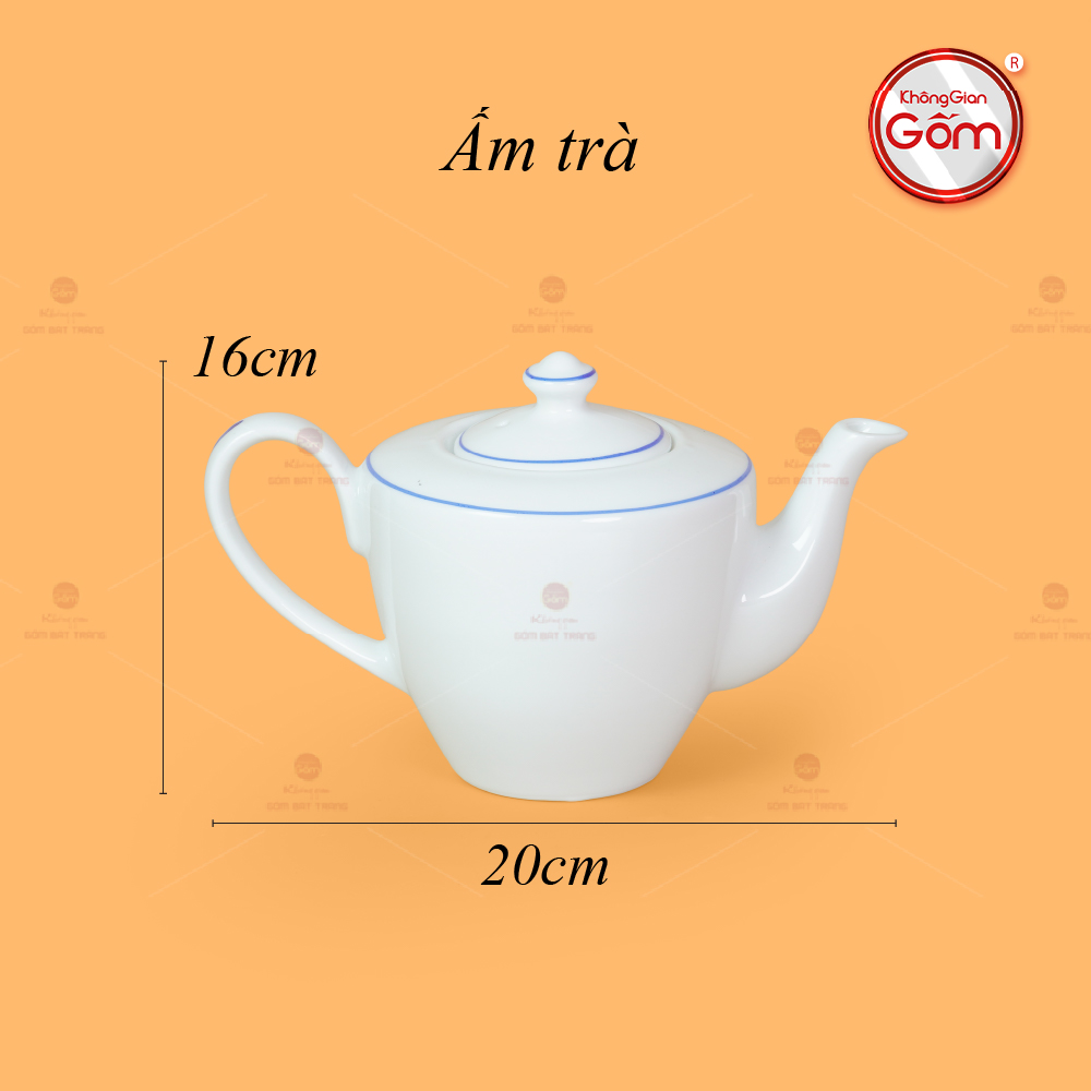 Kẻ Viền Xanh Cobalt: Điểm nhấn tinh tế là đường viền xanh cobalt chạy dọc theo miệng ấm, miệng chén và vành đĩa. Chi tiết này tạo nên sự nổi bật nhẹ nhàng, làm tăng thêm sự sang trọng và tinh tế cho bộ trà.