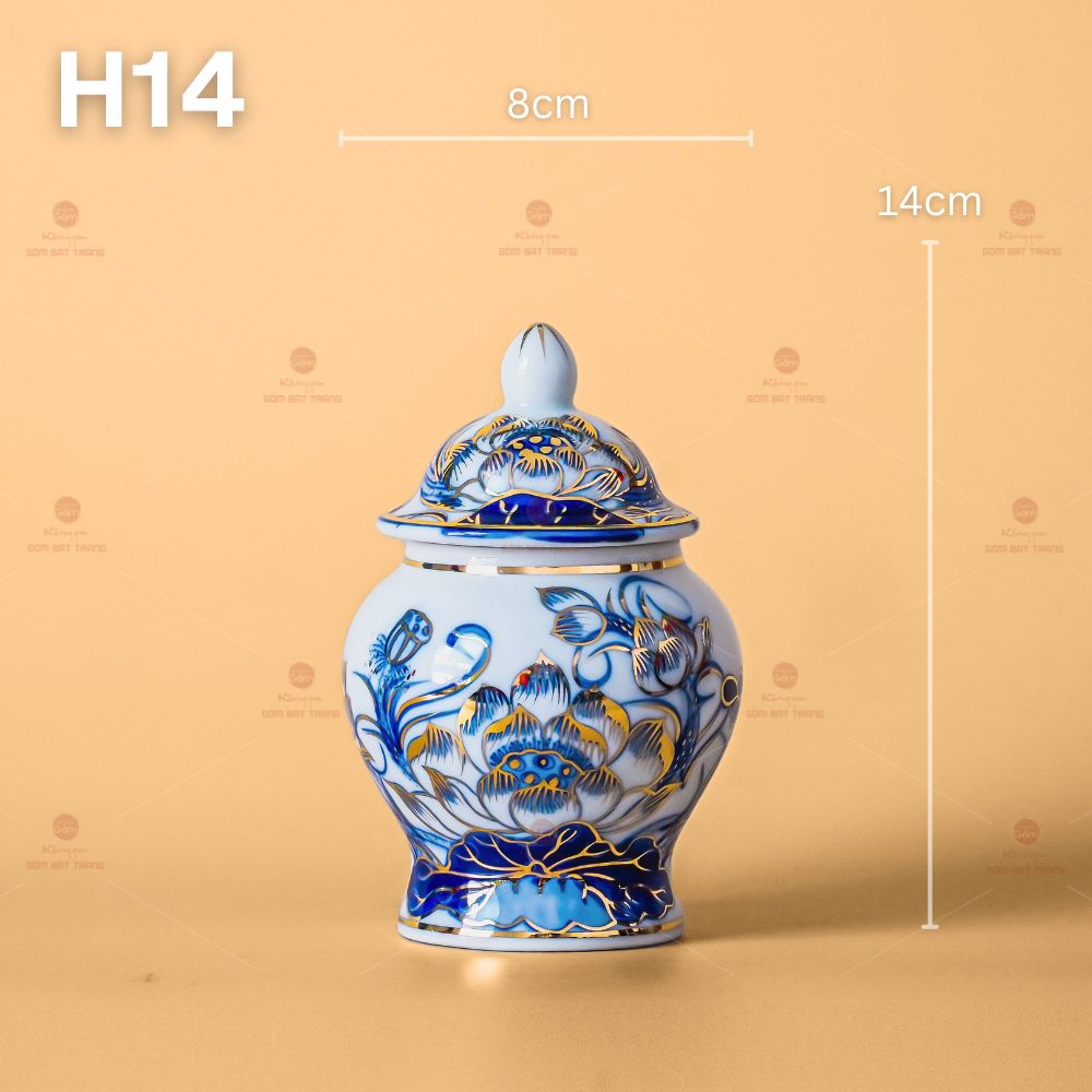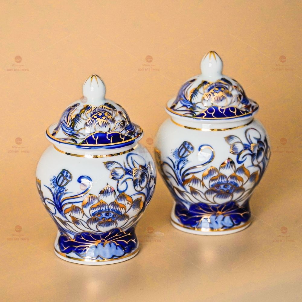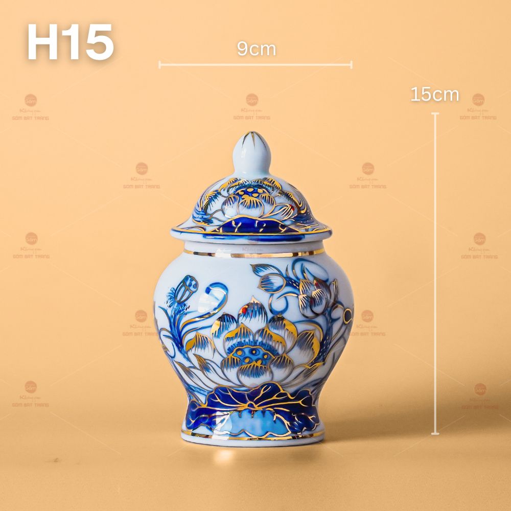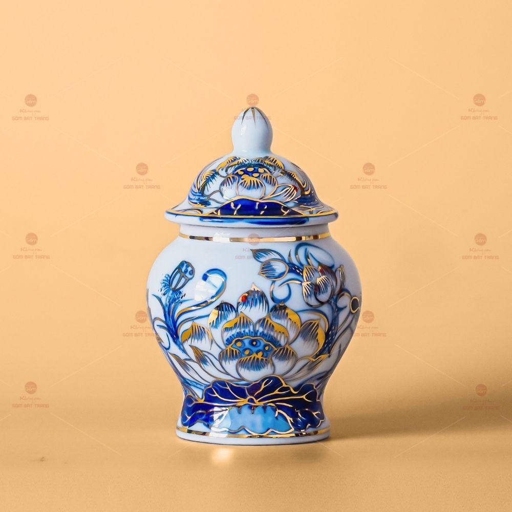 - Chất liệu: Gốm sứ men lam vẽ vàng 24K