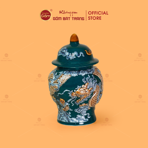 Sản phẩm chóe thờ này nổi bật với sắc men lục tươi mát, tượng trưng cho sự sinh sôi, phát triển, và tài lộc, đặc biệt phù hợp với mệnh Mộc và Hỏa. Họa tiết Cá chép hóa rồng được thể hiện tinh xảo trên thân chóe.