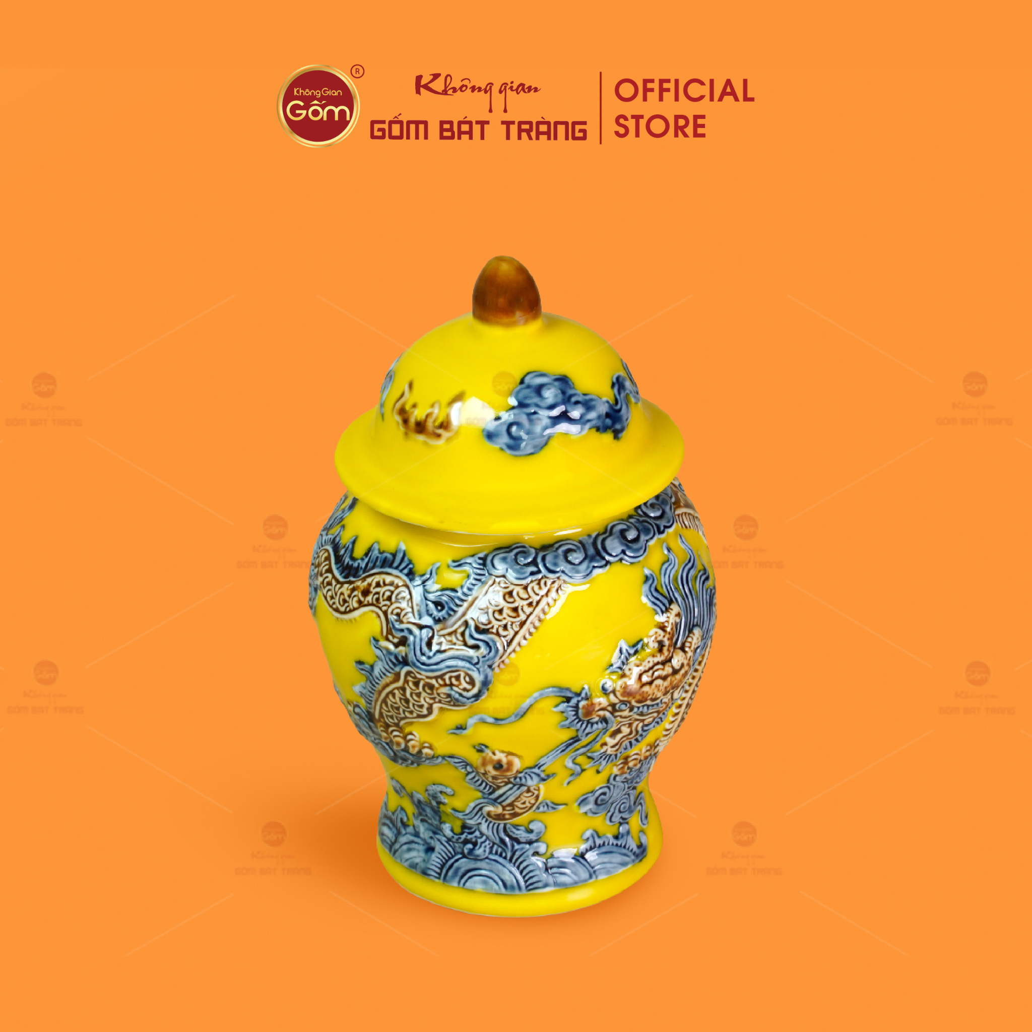 Sản phẩm nổi bật với sắc men vàng rực rỡ, biểu trưng cho tài lộc và quyền quý. Họa tiết rồng được vẽ hoặc đắp nổi tinh xảo, thể hiện uy quyền, sự may mắn, đại cát và đại lợi.