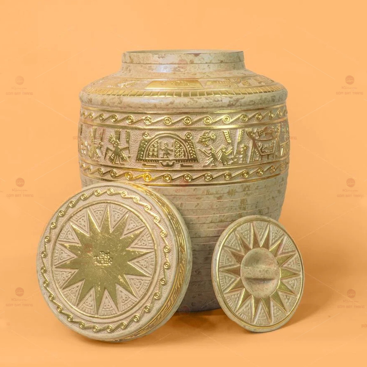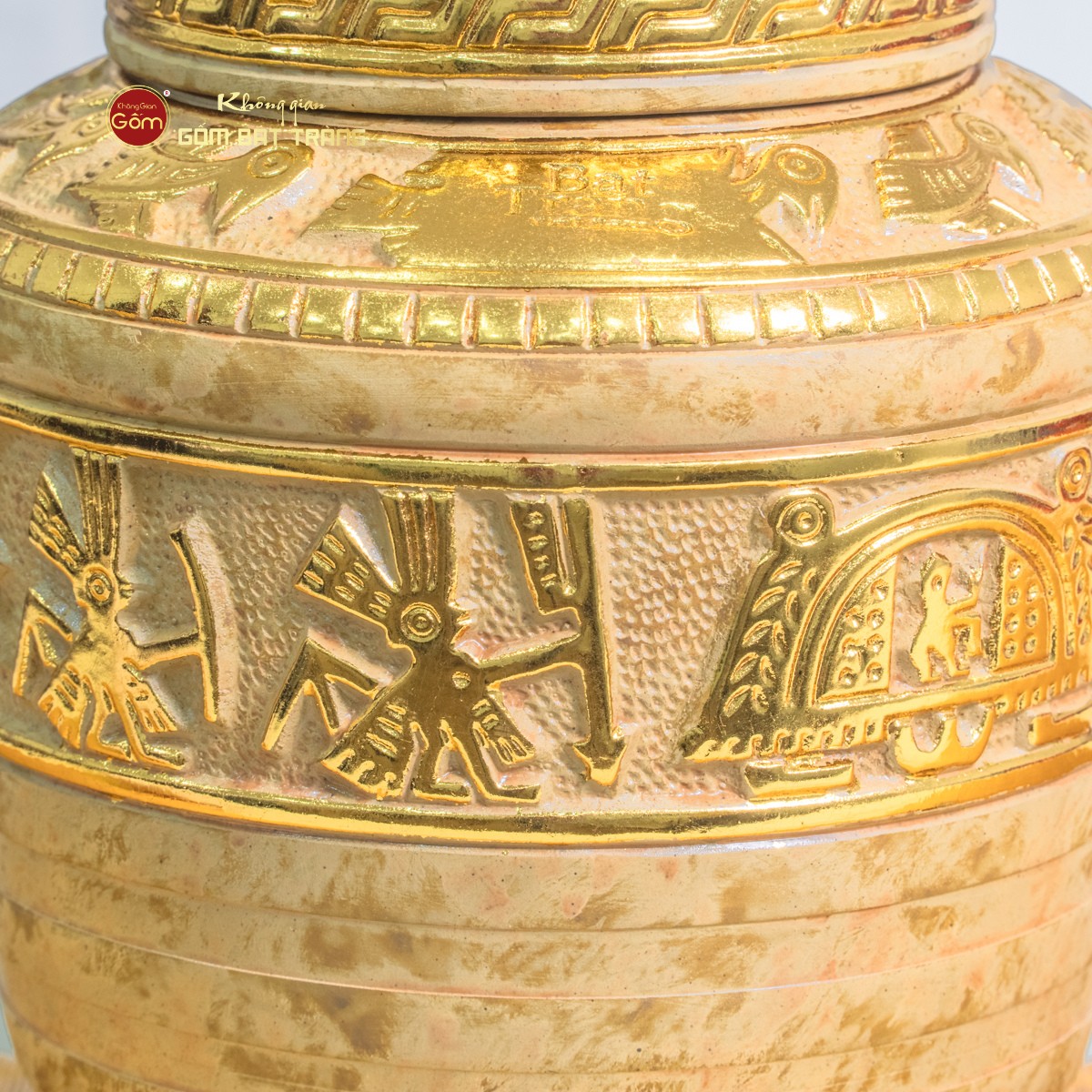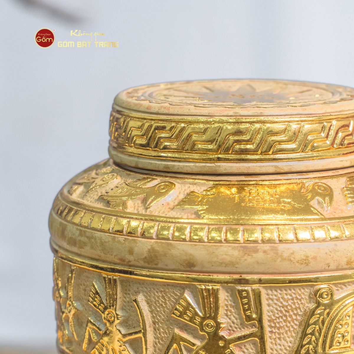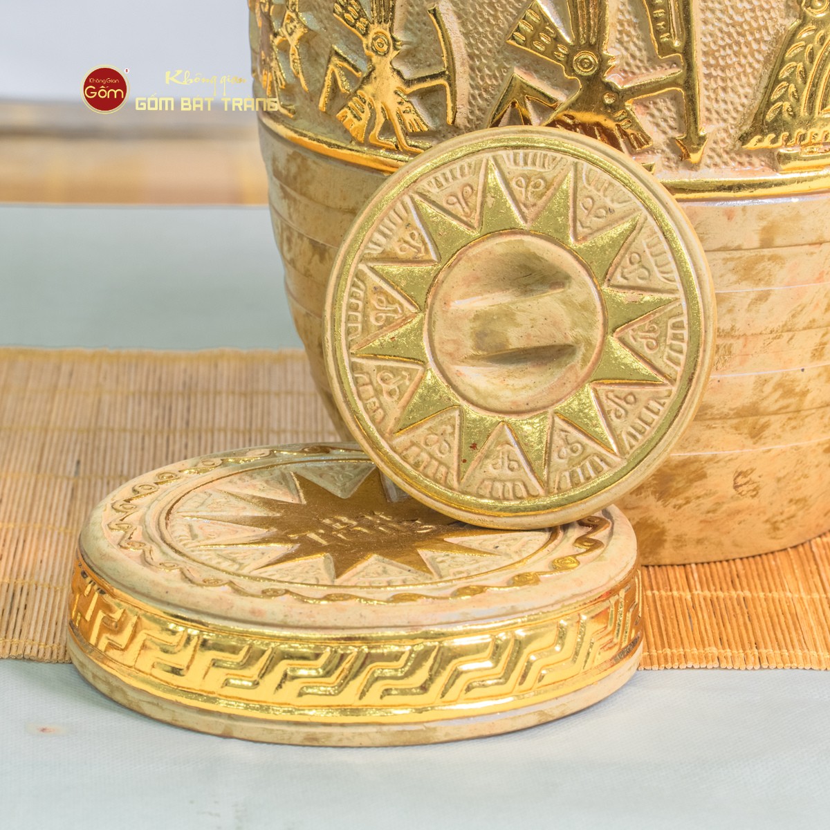 - Họa tiết: Trống Đồng Đông Sơn khắc thủ công đắp nổi dát vàng 24K