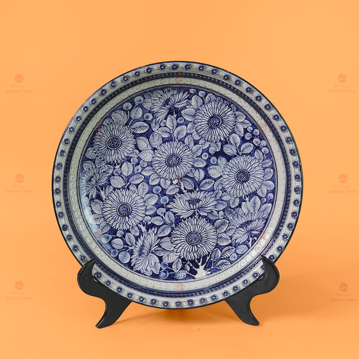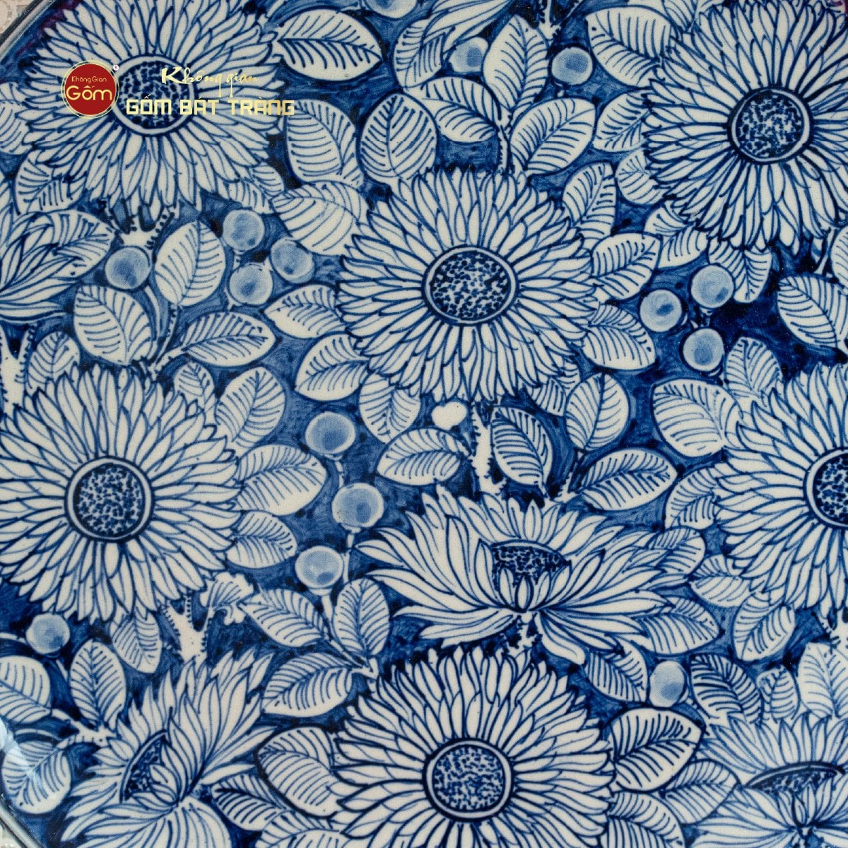 Chiếc đĩa được chế tác tại làng gốm Bát Tràng – nơi hội tụ những bàn tay nghệ nhân lành nghề và tâm huyết. Không sử dụng kỹ thuật đắp nổi, đĩa được tạo hình đều tay từ đất sét trắng đã lọc kỹ, sau đó vẽ họa tiết hoàn toàn thủ công trên nền men lam. Họa tiết “bách hoa” – tức trăm hoa đồng nở – được thể hiện bằng nét cọ tinh xảo và uyển chuyển, tạo nên bức tranh hoa rực rỡ mà không rối mắt. Mỗi đóa hoa đều có đường nét riêng, không trùng lặp, tạo thành một tổng thể hài hòa như khu vườn hoa giữa đời sống vội vã.