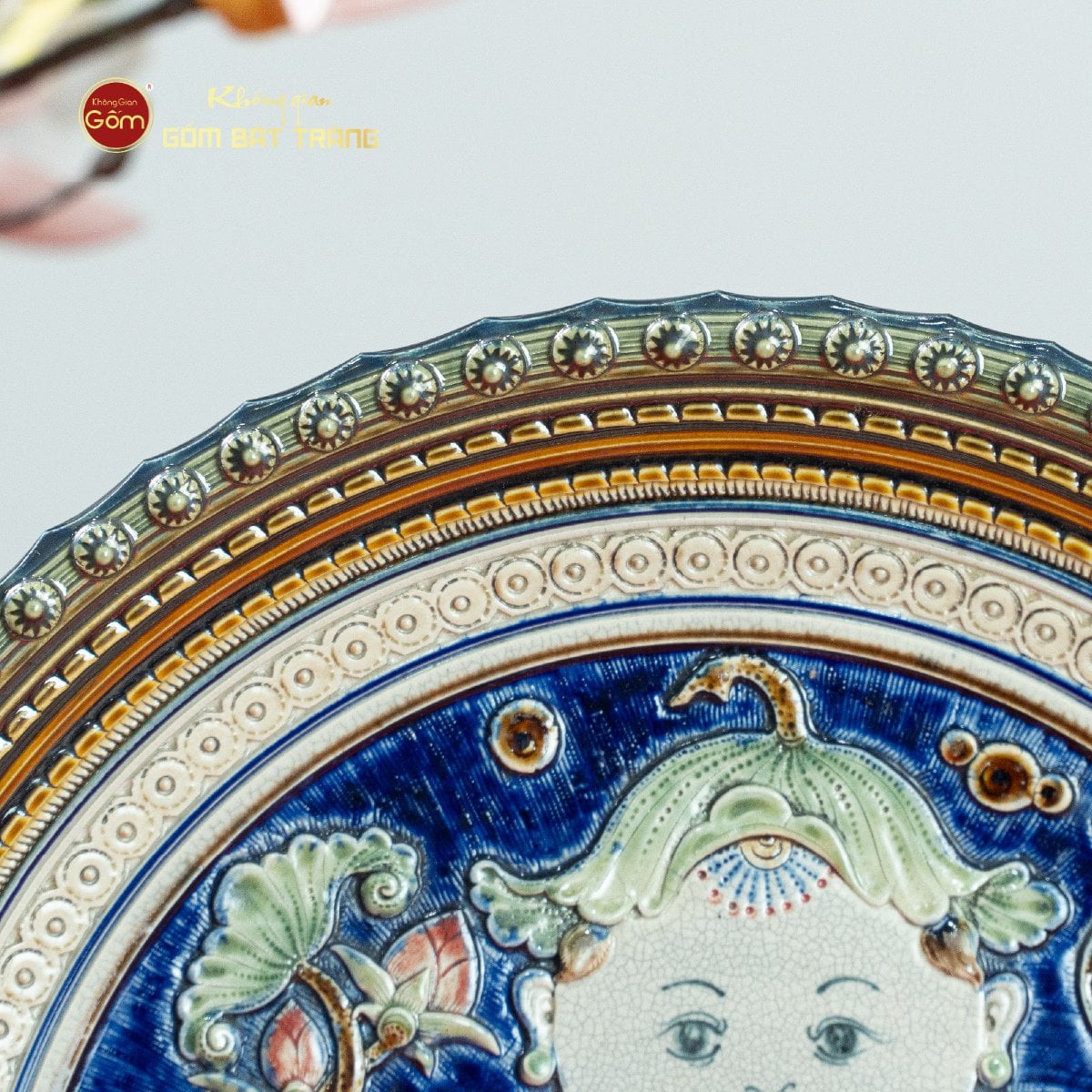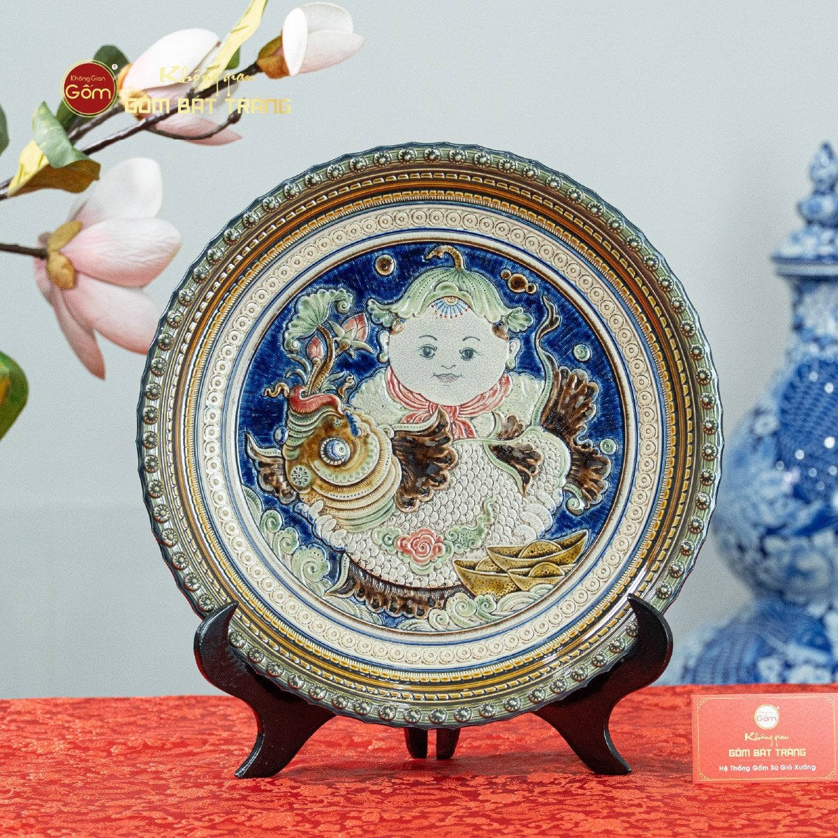 Đĩa Trưng Bày Đắp Nổi Cậu Bé Ôm Cá được chế tác hoàn toàn thủ công bởi các nghệ nhân làng gốm Bát Tràng, nổi bật với kỹ thuật đắp nổi truyền thống tinh xảo. Bề mặt đĩa là hình ảnh cậu bé và chú cá chép sống động, được thể hiện qua từng chi tiết nhỏ như mái tóc, ánh mắt, vảy cá hay hoa sen – tất cả đều được chăm chút tỉ mỉ để tạo nên chiều sâu và hiệu ứng thị giác nổi bật. Màu sắc trên sản phẩm là sự kết hợp hài hòa giữa men lam cổ điển, men rạn truyền thống và các gam màu trầm ấm, tạo cảm giác vừa gần gũi, vừa sang trọng.