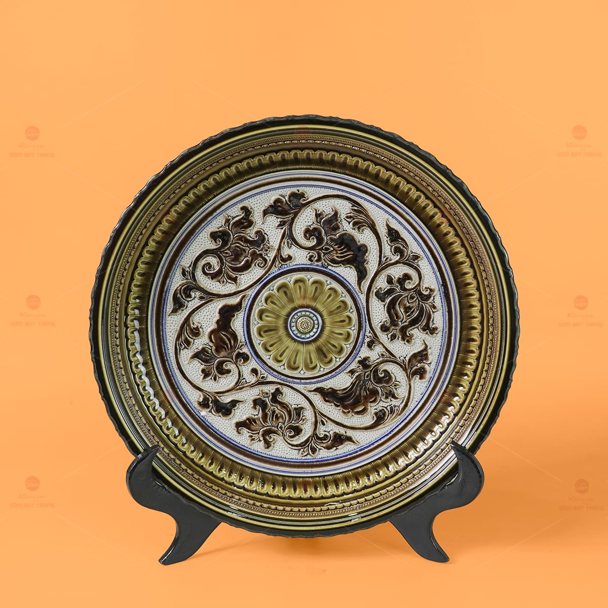 Tông màu chủ đạo của đĩa là men rạn cổ kết hợp với men nâu đồng và men xanh ngọc, giúp sản phẩm mang vẻ đẹp cổ kính, phù hợp với không gian bài trí từ hiện đại đến truyền thống. Viền đĩa được tạo hình nhiều lớp hoa văn cân xứng, tạo cảm giác chắc chắn và nổi bật khi trưng bày. Ngoài ra, sản phẩm đi kèm chân đế gỗ sơn đen cao cấp, giúp dễ dàng trưng bày trên tủ kính, bàn tiếp khách hoặc không gian thờ cúng.