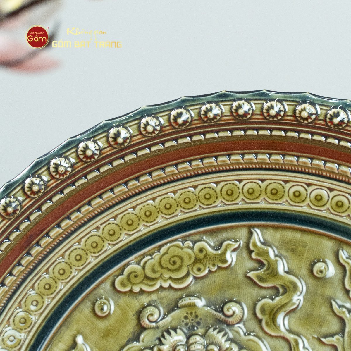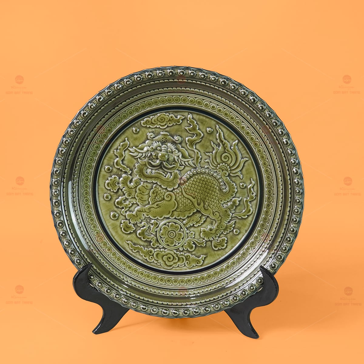 Sản phẩm đĩa “Long Vân Quy Phụng” được chế tác từ gốm sứ Bát Tràng cao cấp, nổi bật với kỹ thuật đắp nổi tinh xảo – một trong những nghệ thuật đỉnh cao trong làng nghề gốm truyền thống. Họa tiết Lân được đắp tay hoàn toàn, mang lại cảm giác chân thực, sống động và đầy chiều sâu. Lớp men xanh rêu cổ điển phủ đều khắp bề mặt đĩa tạo hiệu ứng ánh sáng tuyệt đẹp, giúp tôn lên vẻ đẹp uy nghiêm và thanh thoát của sản phẩm. Viền đĩa được thiết kế tỉ mỉ với hoa văn tròn đối xứng, tạo điểm nhấn sang trọng và cân đối. Đặc biệt, sản phẩm đi kèm chân đế gỗ chắc chắn, giúp đĩa đứng vững khi trưng bày, đồng thời nâng cao tính thẩm mỹ tổng thể.