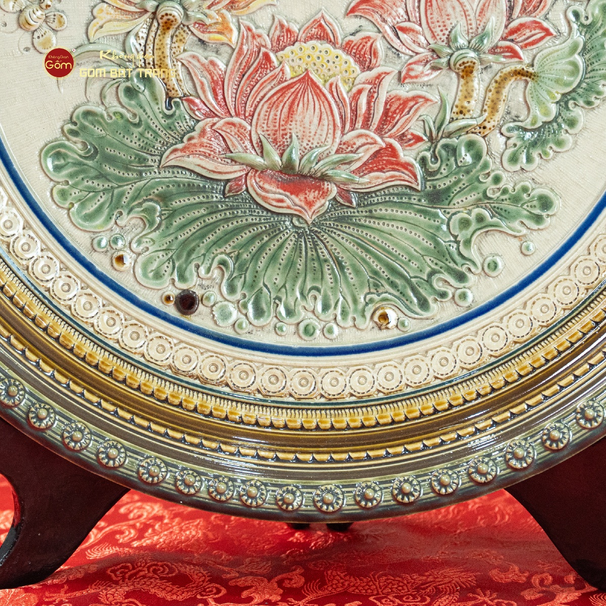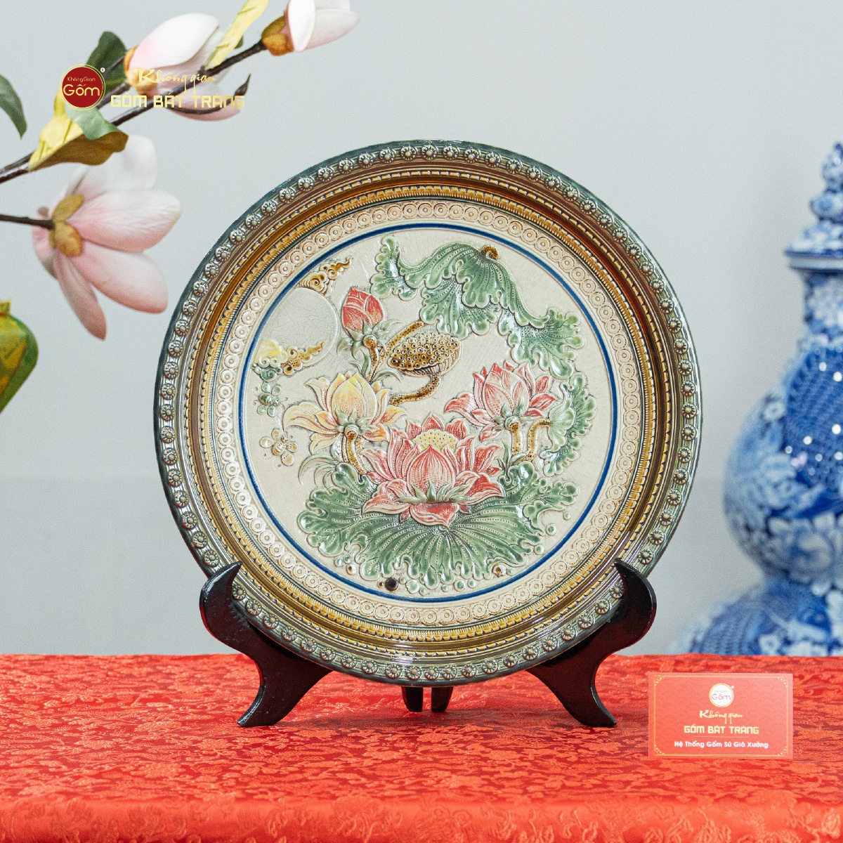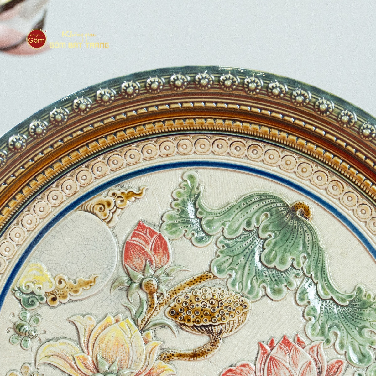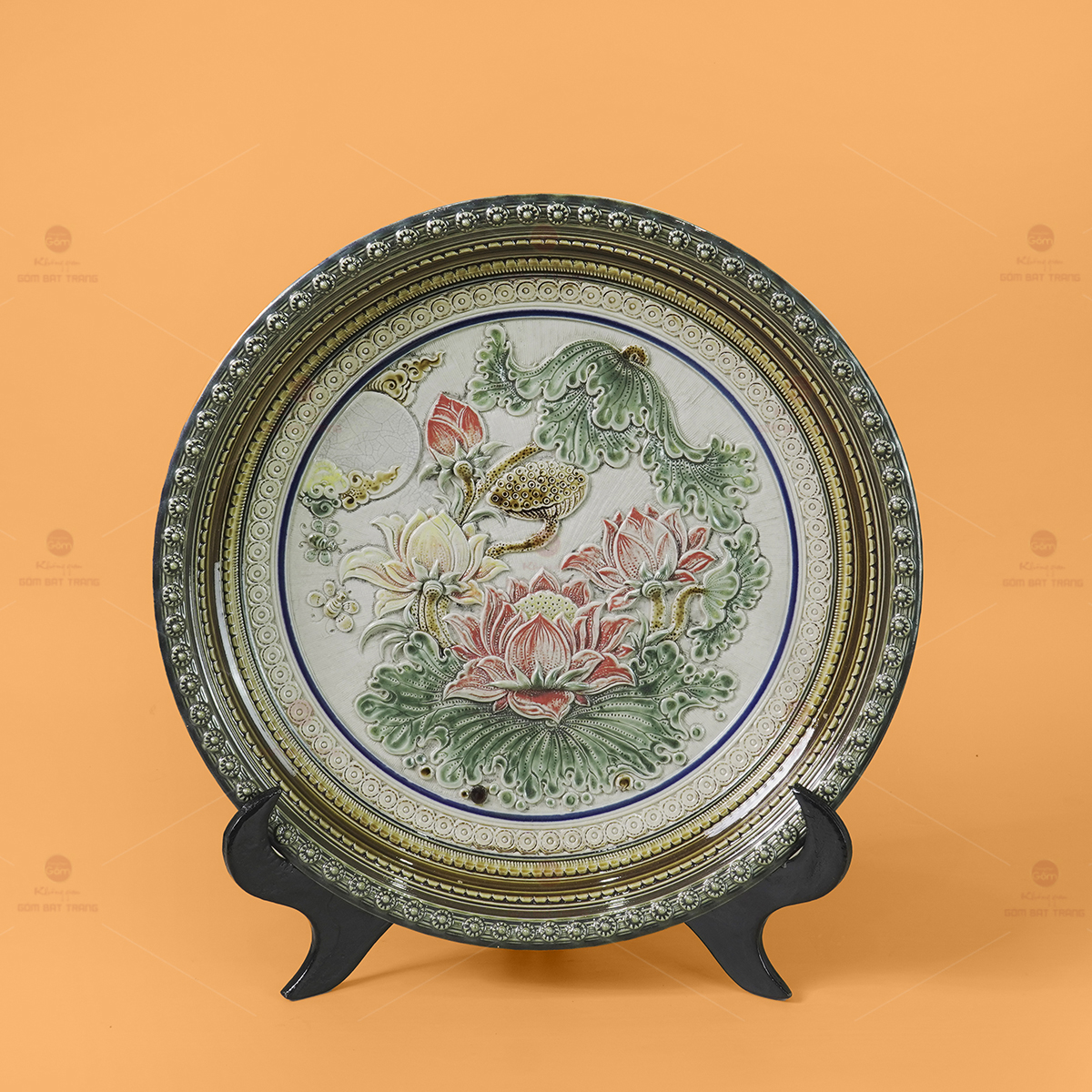 - Tên sản phẩm: Đĩa Trưng Bày Đắp Nổi Vẽ Màu Hoa Sen Ánh Trăng