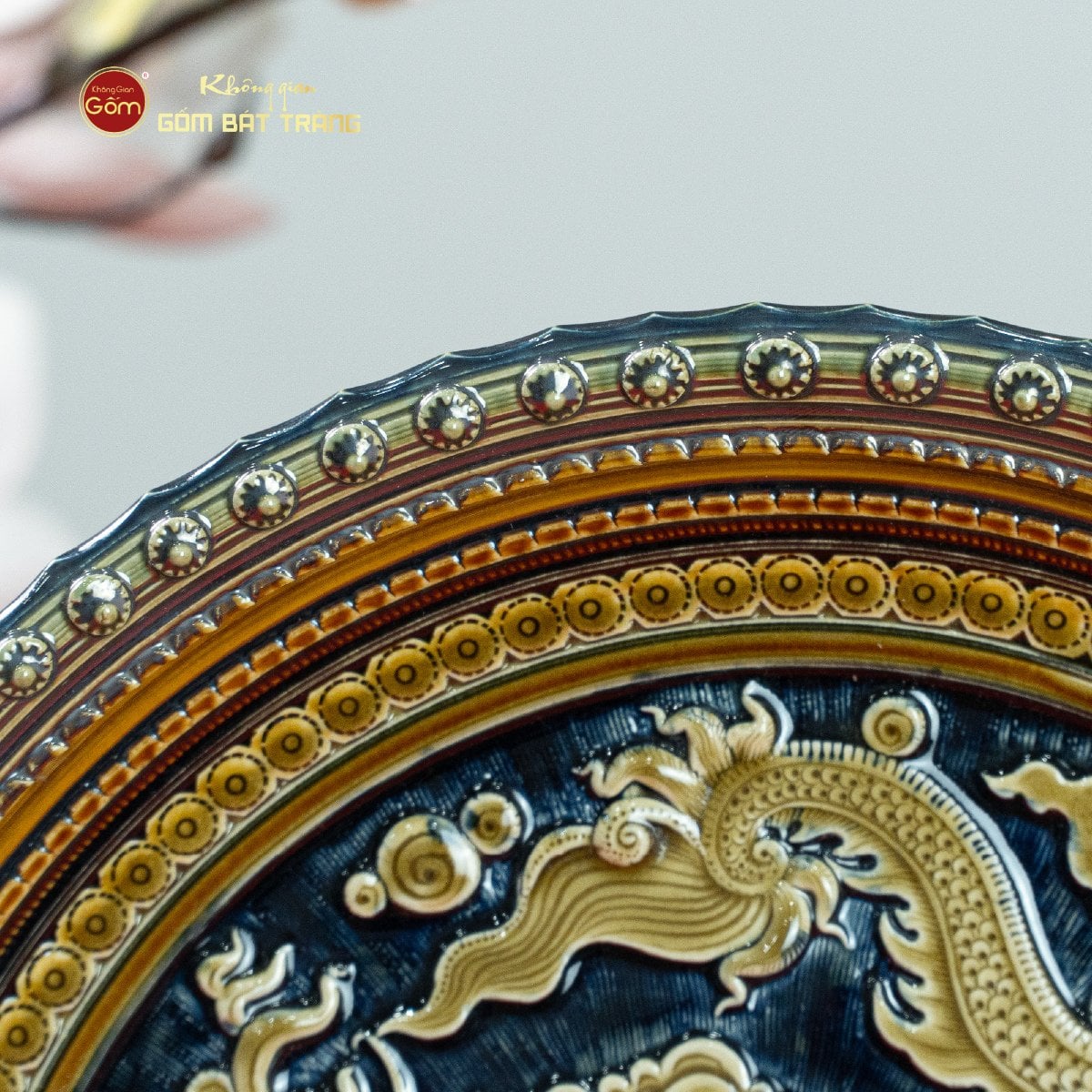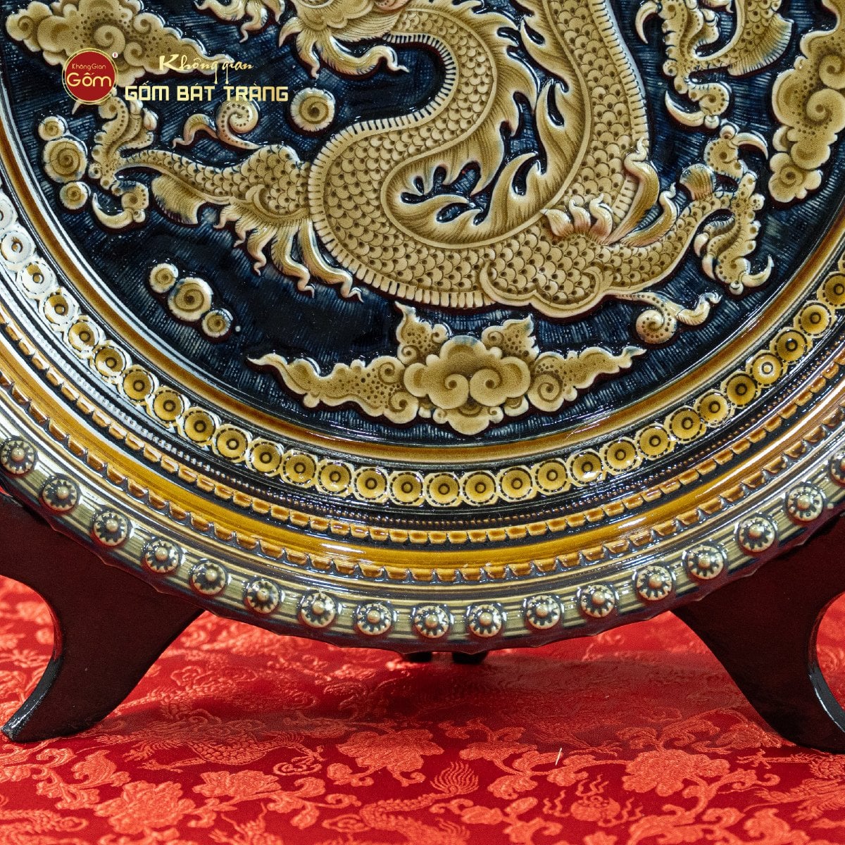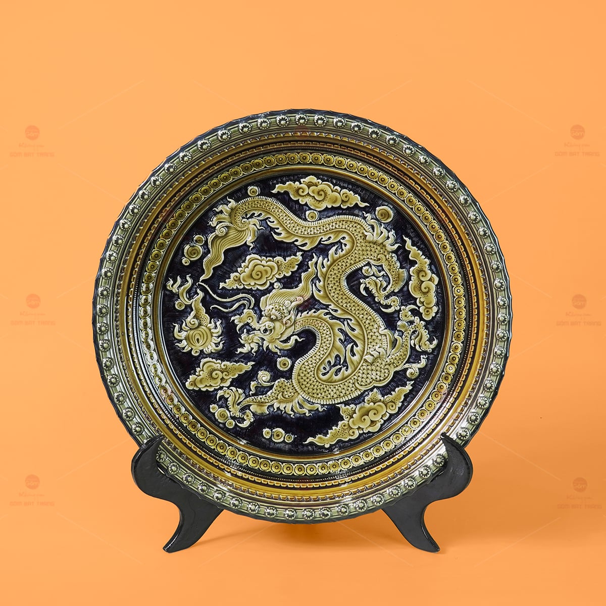 Đĩa Trưng Bày Khắc Nổi Vẽ Màu Nền Xanh Đen Long Cuốn Thủy chuyên dùng cho trưng bày nội thất, trang trí và tạo điểm nhấn cho những không gian chung. Tác phẩm đĩa gốm sứ Bát Tràng tinh xảo với thiết kế đĩa trang trí hình tròn, được đặt trên đế trưng bày màu đen. Đĩa có nền xanh đen sang trọng, nổi bật với hình ảnh rồng vàng (Long Cuốn Thủy) được khắc nổi tỉ mỉ cùng các họa tiết mây, sóng nước và các chi tiết trang trí tinh xảo.