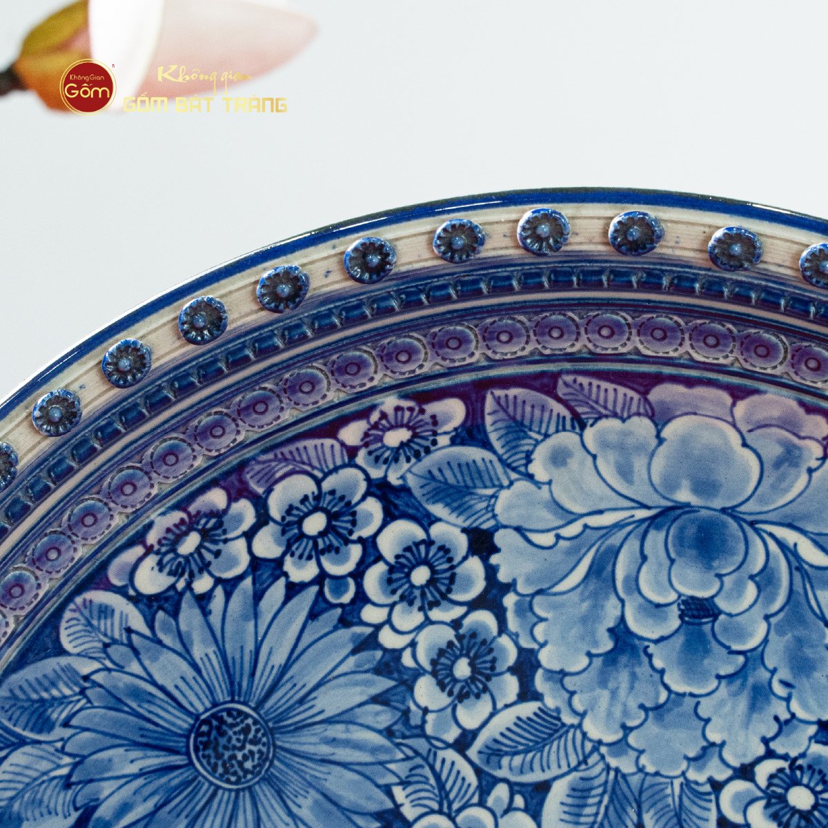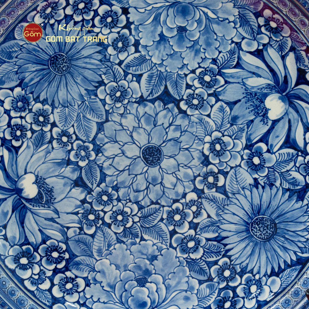 Đĩa Trưng Bày Men Lam Ngàn Hoa Hội Tụ là một tác phẩm gốm sứ thủ công tinh xảo đến từ làng nghề truyền thống Bát Tràng, nổi bật với đường kính 35cm và vẻ đẹp dịu dàng nhưng đầy sức hút của họa tiết hoa cỏ được vẽ tay tỉ mỉ. Lấy cảm hứng từ muôn loài hoa đang mùa nở rộ, chiếc đĩa là sự hội tụ của nhiều loài hoa biểu trưng cho sắc đẹp, sự sống và may mắn, được thể hiện sinh động qua sắc lam cổ điển đặc trưng của dòng men lam Bát Tràng.