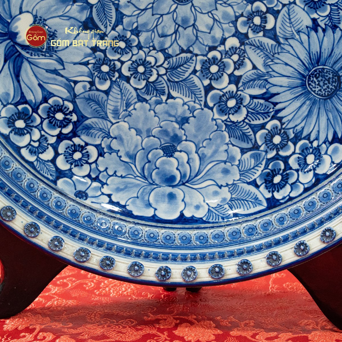 Viền đĩa được cách điệu với những đường nét mềm mại, mô phỏng sóng nước và hoa văn cổ, góp phần nâng đỡ cho trung tâm ngàn hoa tỏa sáng. Thiết kế này không chỉ tăng giá trị thẩm mỹ mà còn mang ý nghĩa bảo hộ, lan tỏa năng lượng an lành đến không gian sống.