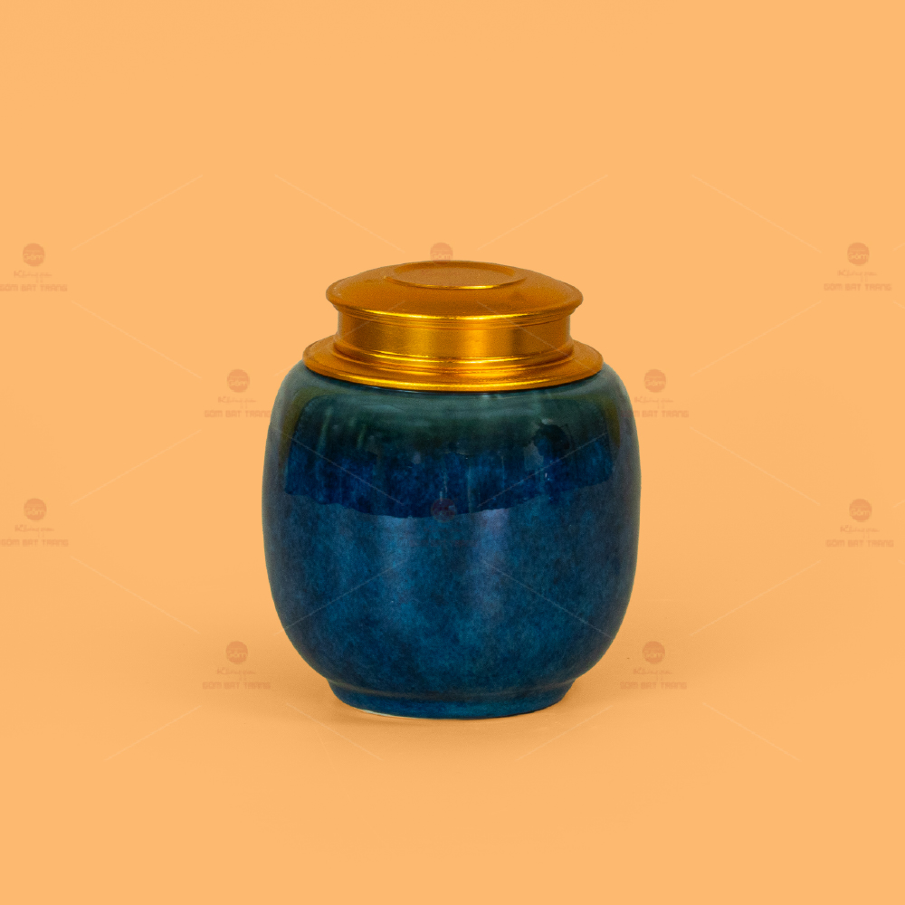 Hũ Đựng Trà Men Hỏa Biến Xanh là một sản phẩm gốm sứ nghệ thuật, được chế tác tinh xảo tại Bát Tràng, mang vẻ đẹp độc đáo và công năng bảo quản vượt trội. Sản phẩm nổi bật với lớp men hỏa biến xanh (xanh lam, xanh dương đậm) độc đáo, tạo ra những vệt màu loang ngẫu nhiên, huyền ảo, làm cho mỗi chiếc hũ có một vẻ ngoài duy nhất, không trùng lặp. Kết hợp cùng chiếc nắp kín màu vàng kim sang trọng, hũ trà mang lại sự hài hòa giữa vẻ đẹp ngẫu hứng của lửa và sự quý phái. Đây là lựa chọn lý tưởng để cất giữ những loại trà hảo hạng, đồng thời là một vật phẩm trang trí có chiều sâu, thể hiện gu thẩm mỹ khác biệt của quý khách hàng.