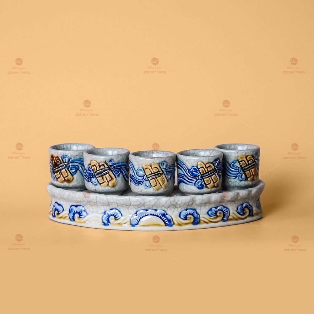 - Tên sản phẩm: Kỷ 5 Chén Thờ Men Rạn Nổi Họa Tiết Cuốn Thư