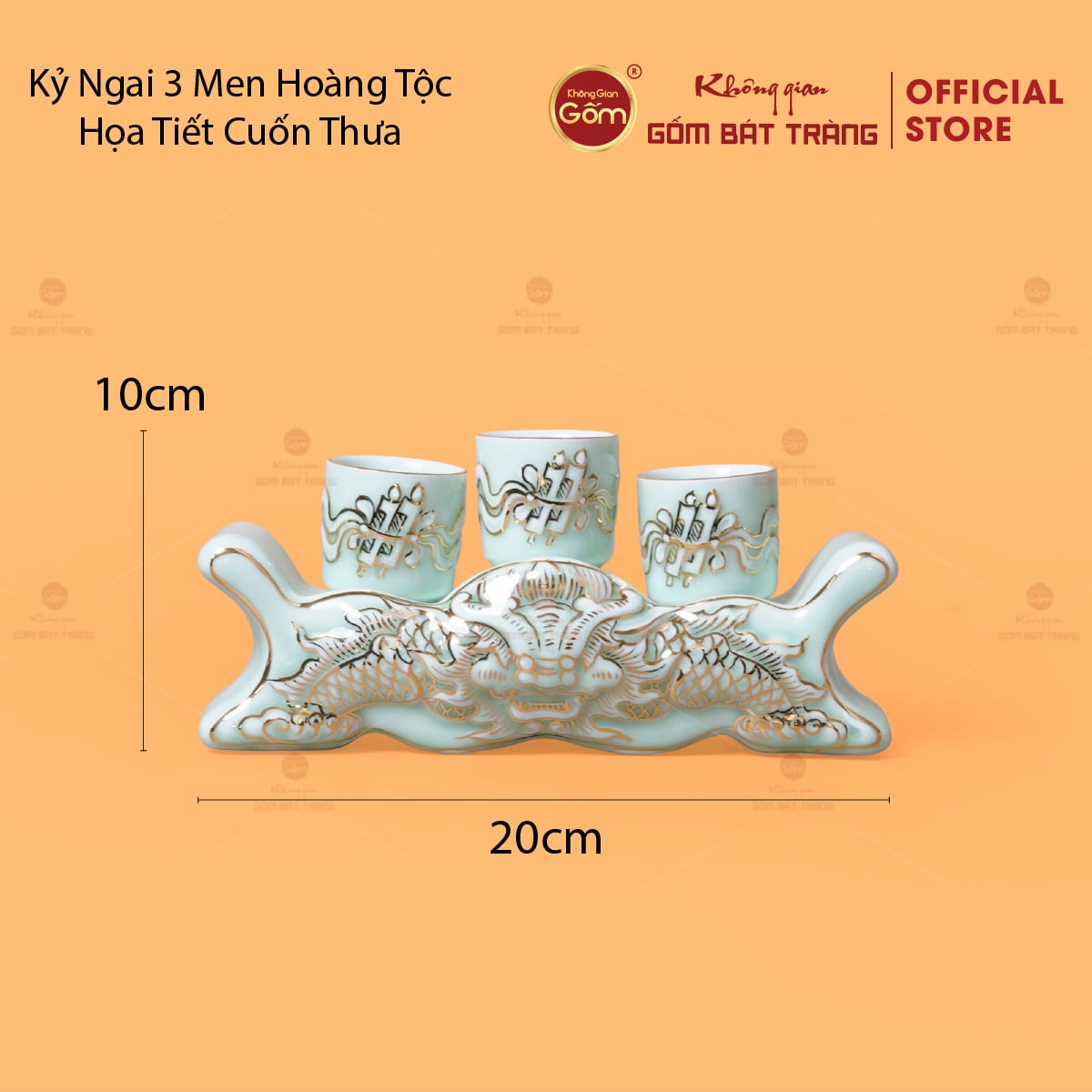 - Tên sản phẩm: Kỷ Ngai 3 Chén Thờ Men Ngọc Hoàng Tộc Vẽ Vàng Cuốn Thư