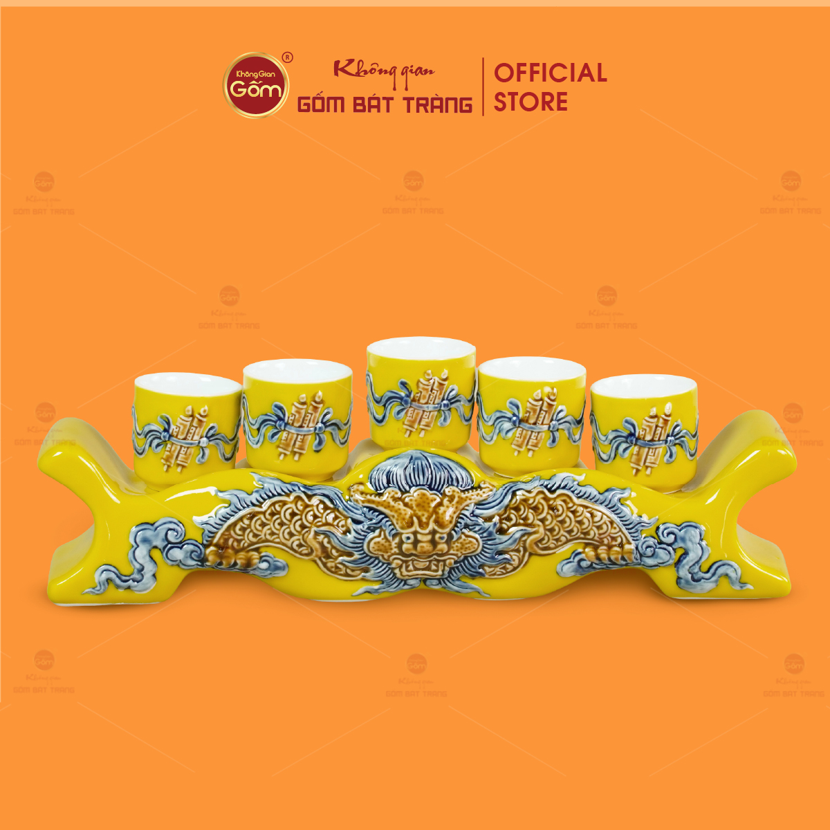 - Tên sản phẩm: Kỷ Ngai 5 Chén Thờ Men Vàng Họa Tiết Cuốn Thư