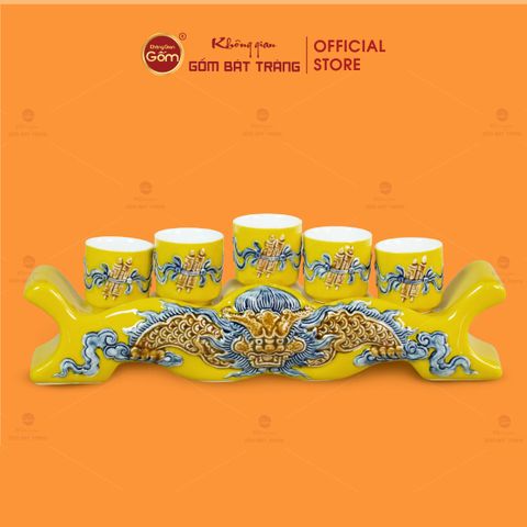 Kỷ Ngai 5 Chén Thờ Men Vàng Họa Tiết Cuốn Thư