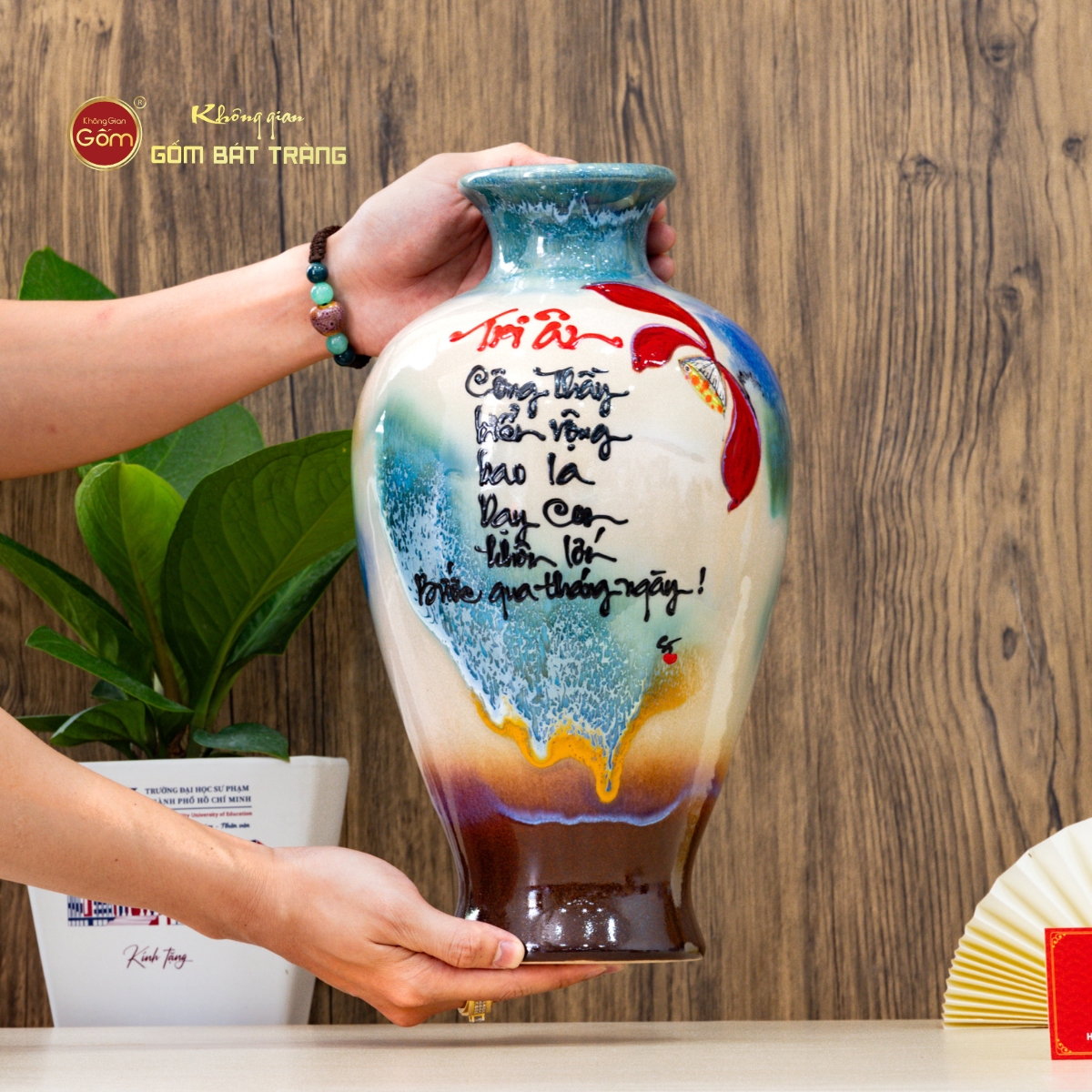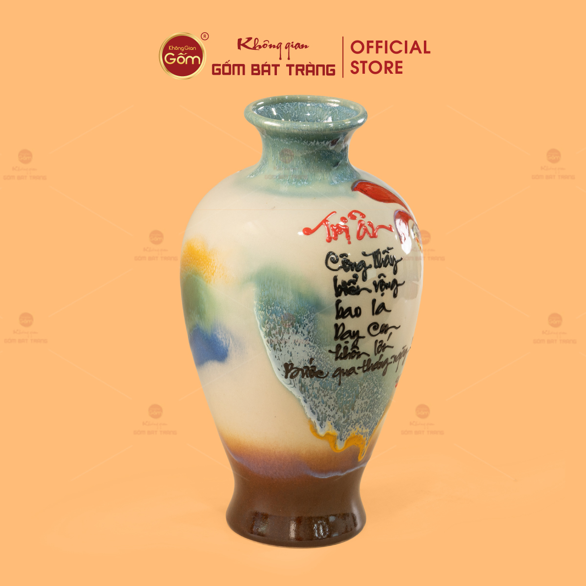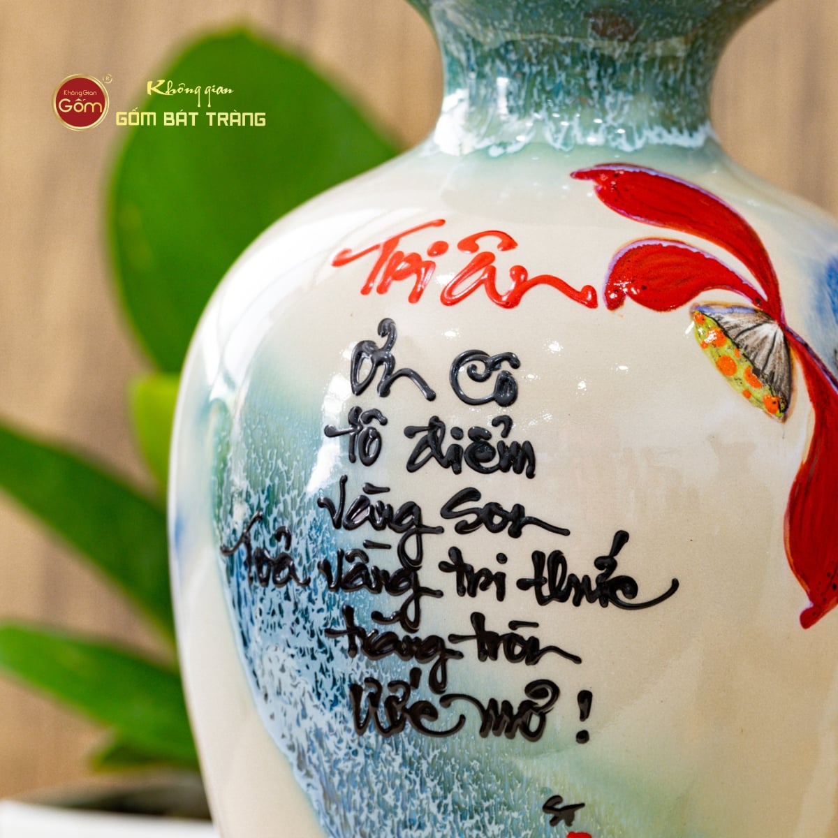 Họa tiết thư pháp được vẽ tay trực tiếp bởi nghệ nhân, từng nét mực uyển chuyển thể hiện tinh thần phóng khoáng, mang ý nghĩa gửi gắm lời chúc, triết lý sống và nét đẹp tâm hồn Việt. Sự kết hợp giữa men chảy hiện đại và nghệ thuật thư pháp truyền thống giúp chiếc lọ trở thành một điểm nhấn nổi bật trong phòng khách, phòng làm việc hay không gian trưng bày.