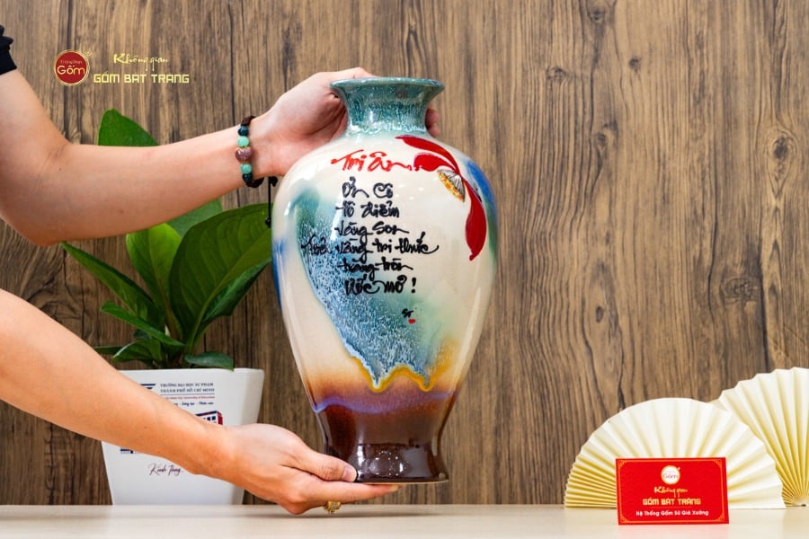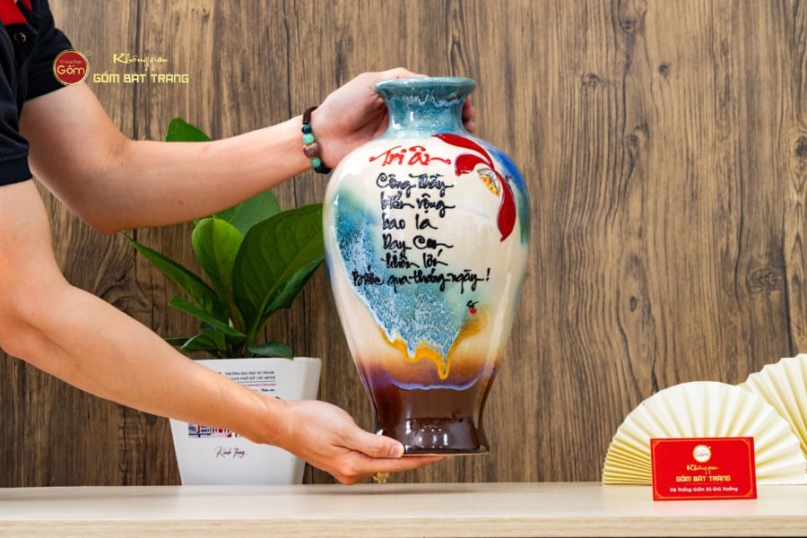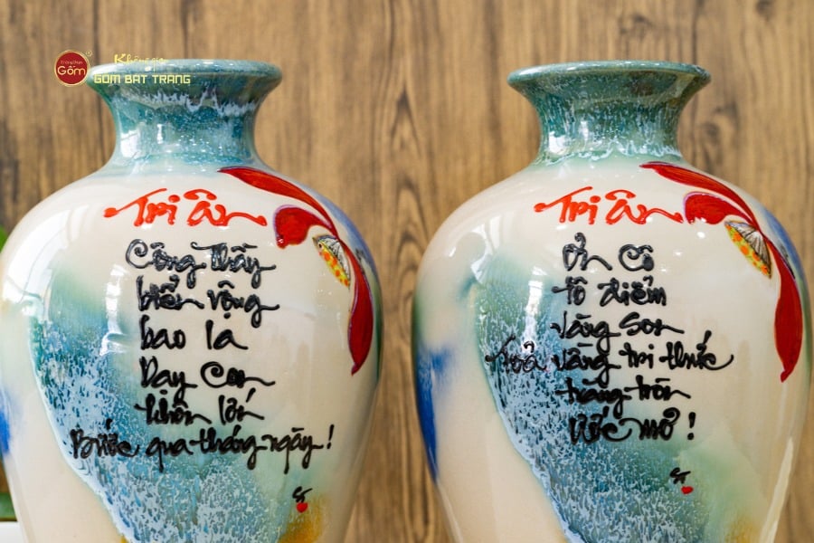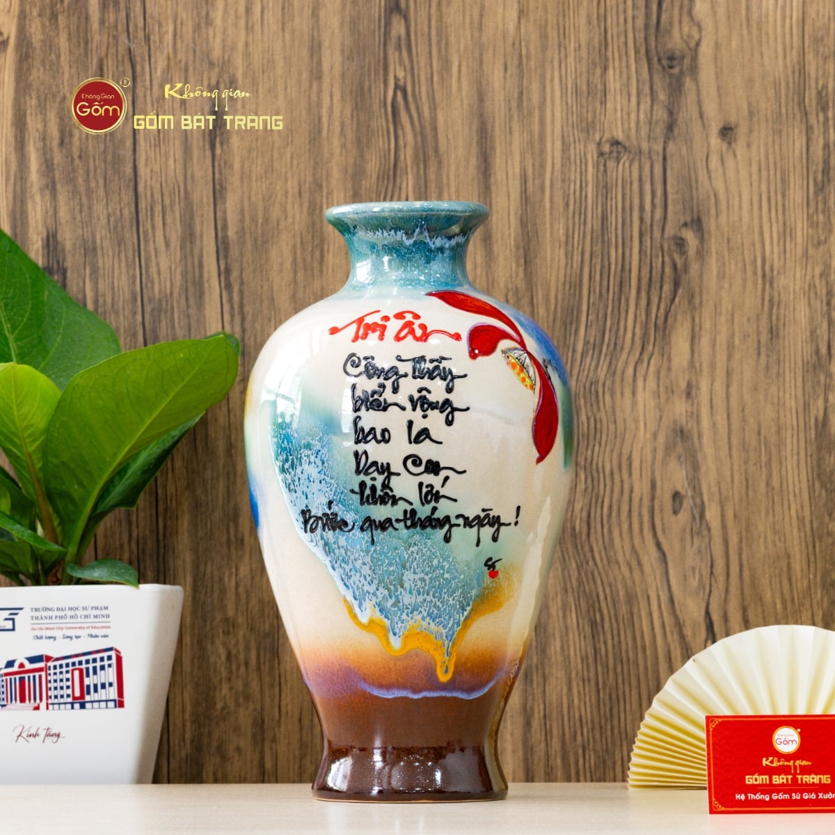 Họa tiết thư pháp được vẽ tay trực tiếp bởi nghệ nhân, từng nét mực uyển chuyển thể hiện tinh thần phóng khoáng, mang ý nghĩa gửi gắm lời chúc, triết lý sống và nét đẹp tâm hồn Việt. Sự kết hợp giữa men chảy hiện đại và nghệ thuật thư pháp truyền thống giúp chiếc lọ trở thành một điểm nhấn nổi bật trong phòng khách, phòng làm việc hay không gian trưng bày.
