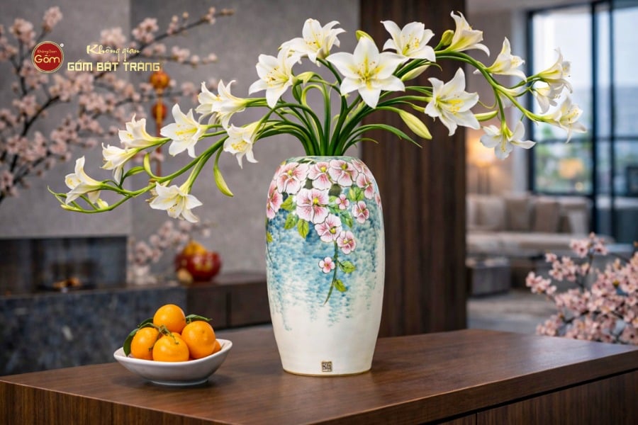 Chất lượng ưu việt: Lọ hoa sở hữu cốt gốm sứ Bát Tràng dày dặn, cầm chắc tay. Bề mặt được bao phủ bởi lớp men bóng mịn, không chỉ giúp bảo vệ các chi tiết đắp nổi mà còn chống bám bẩn, giúp việc vệ sinh trở nên dễ dàng.