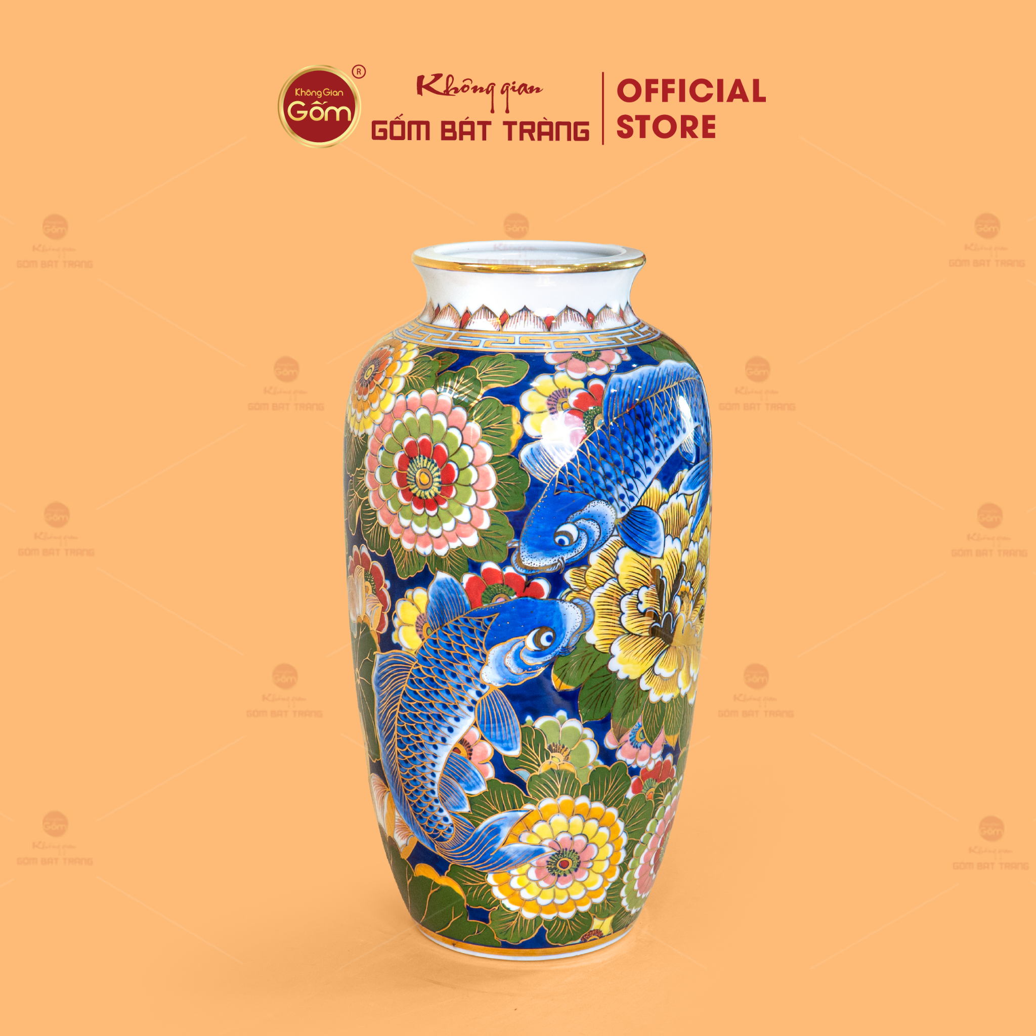 Kỹ thuật vẽ vàng kim: Từng cánh sen rạng rỡ và hình ảnh cá chép trông trăng được nghệ nhân sử dụng vàng 24K để tô điểm. Ánh kim loại quyện cùng lớp men sứ tạo nên hiệu ứng lấp lánh sang trọng, đặc biệt nổi bật dưới ánh đèn vàng hoặc ánh sáng tự nhiên.