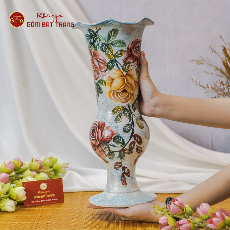 Lọ hoa vẽ tay vẽ hoa hồng và các mẫu lọ hoa vẽ tay cao cấp khác đang được kinh doanh tại các chi nhánh của Không Gian Gốm Bát Tràng. Mỗi chiếc lọ là tâm huyết nhiều giờ lao động và sự sáng tạo làm mới sản phẩm của các nghệ nhân và thợ làm gốm. Lọ hoa bền chắc, vẽ họa tiết tỉ mỉ đến sinh động được nhiều khách hàng yêu thích chọn mua làm đồ trang trí nội thất và quà tặng ấn tượng.