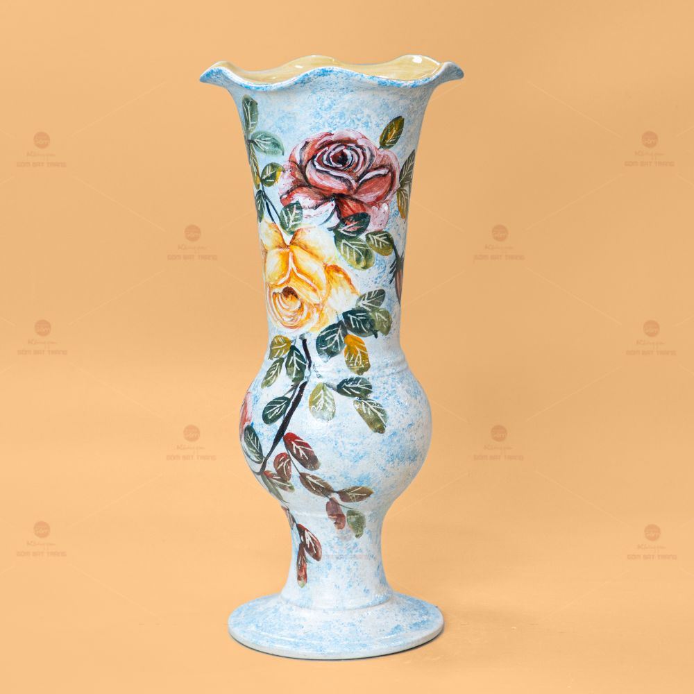 Lọ hoa vẽ tay hoa hồng có kiểu dáng như một chiếc ly cổ loe, dáng lọ cao nên dùng được với nhiều loài hoa và phong cách cắm hoa khác nhau. Lọ hoa to vững chãi, cứng cáp và trưng bày được ở nhiều không gian kể cả bàn lễ tân hay góc phòng trưng bày.