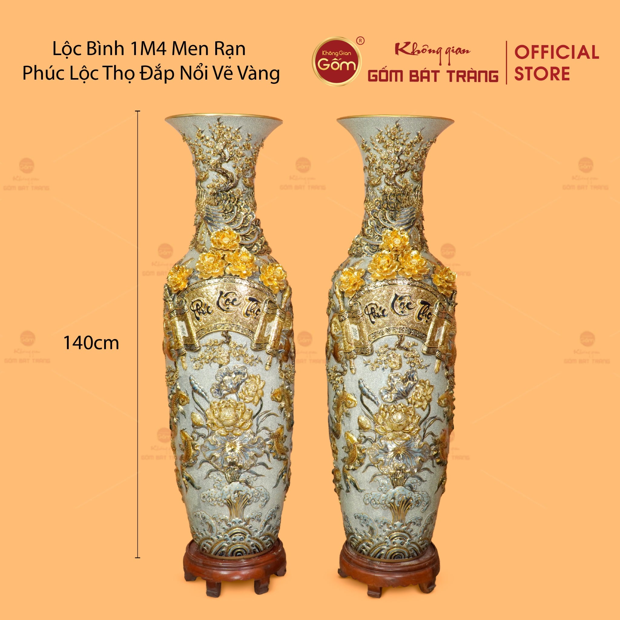 - Tên sản phẩm: Lộc Bình 1M4 Men Rạn Phúc Lộc Thọ Đắp Nổi Vẽ Vàng