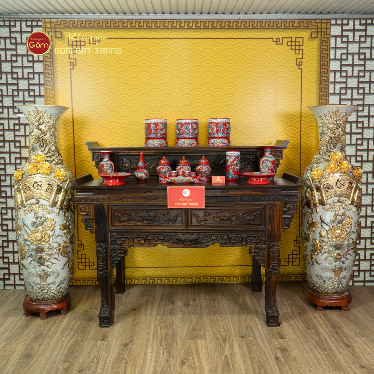Sản phẩm hiện có mặt tại hệ thống cửa hàng của Không Gian Gốm trên toàn quốc. Chúng tôi cung cấp dịch vụ trọn gói: tư vấn chọn kích thước (1m4, 1m6...), tặng kèm đôn gỗ cao cấp, vận chuyển và lắp đặt tận nơi an toàn tuyệt đối. Đặc biệt, chúng tôi nhận chế tác vẽ vàng theo yêu cầu riêng, khắc tên cung tiến để phù hợp với nhu cầu biếu tặng, công đức.