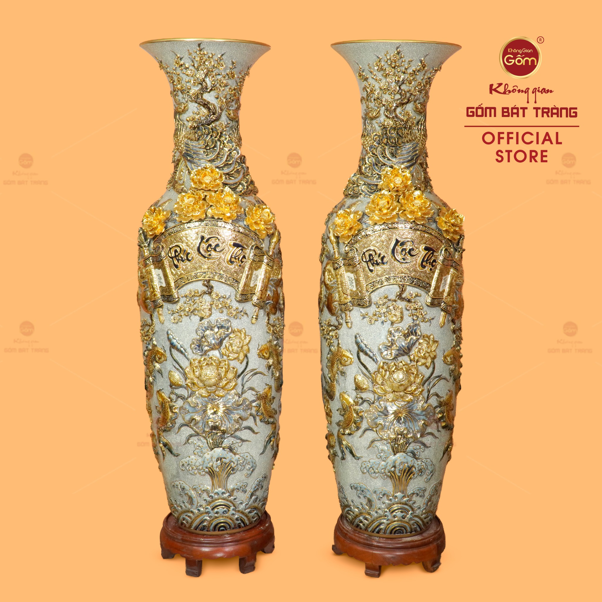 Điểm nhấn nổi bật nhất tạo nên giá trị vượt trội của sản phẩm chính là kỹ thuật vẽ vàng tinh xảo trên các họa tiết đắp nổi. Ba chữ thư pháp “Phúc – Lộc – Thọ” cùng các hình tượng linh thú, tùng cúc trúc mai không chỉ được đắp nổi kênh bong tạo khối 3D, mà còn được điểm xuyết những nét vàng kim óng ánh. Ánh vàng rực rỡ nổi bật trên nền men rạn ngà xám tạo nên độ tương phản mạnh mẽ, thu hút mọi ánh nhìn và khẳng định vị thế vương giả của người sở hữu.