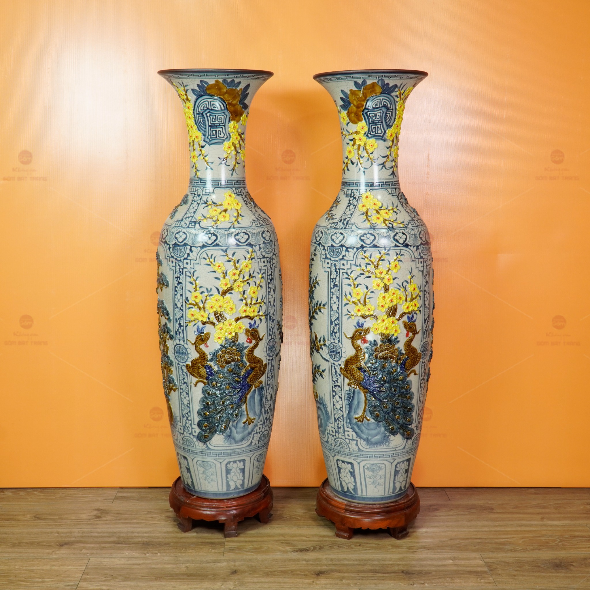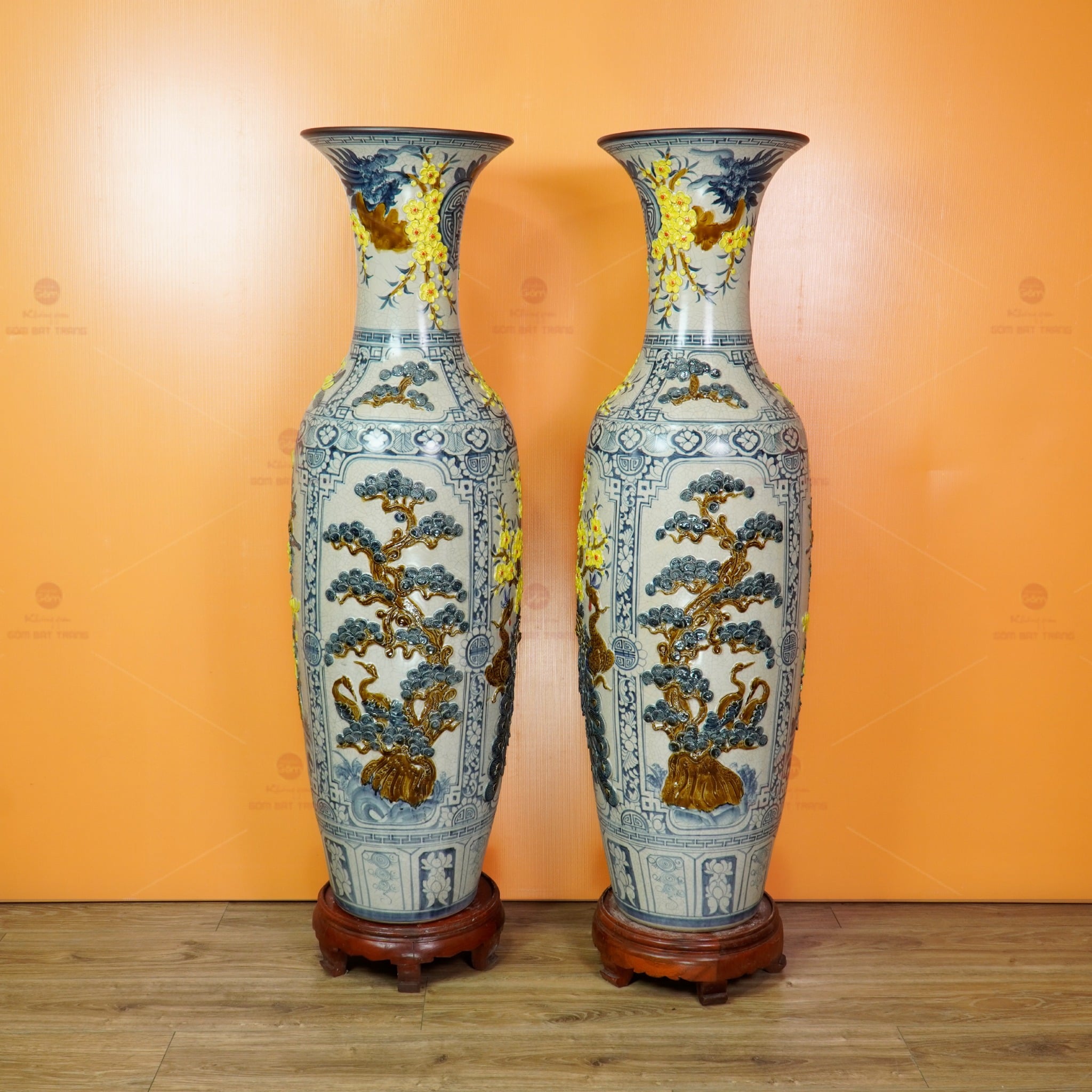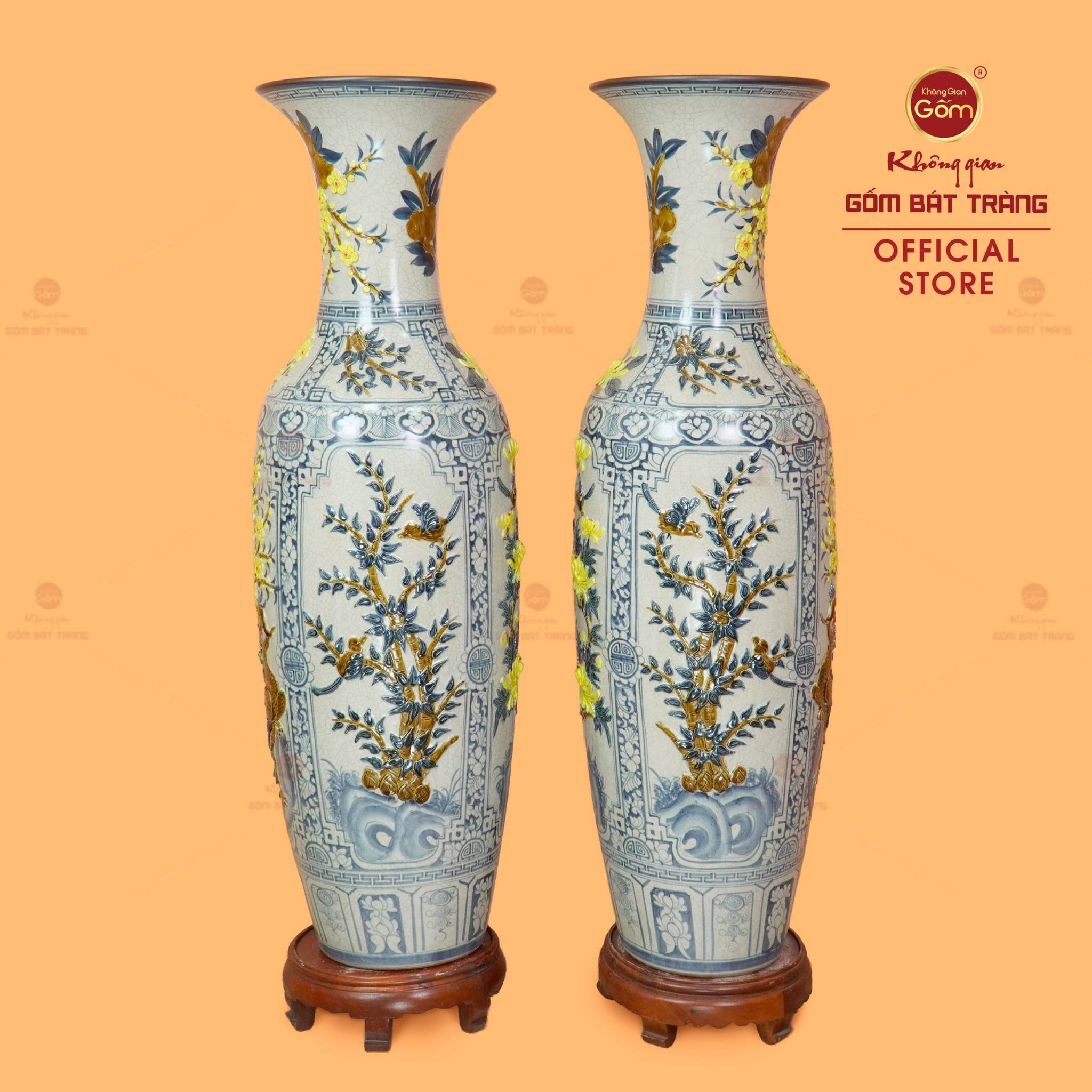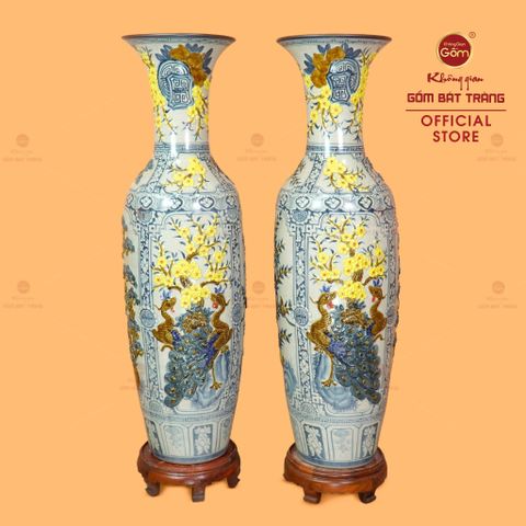 Lộc Bình 1M4 Men Rạn Tứ Quý Hoa Vàng Đắp Nổi