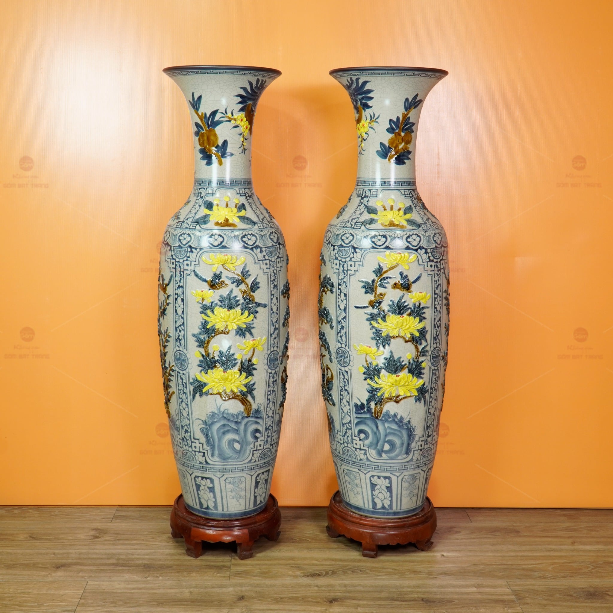 - Tên sản phẩm: Lộc Bình 1M4 Men Rạn Tứ Quý Hoa Vàng Đắp Nổi