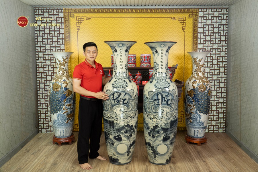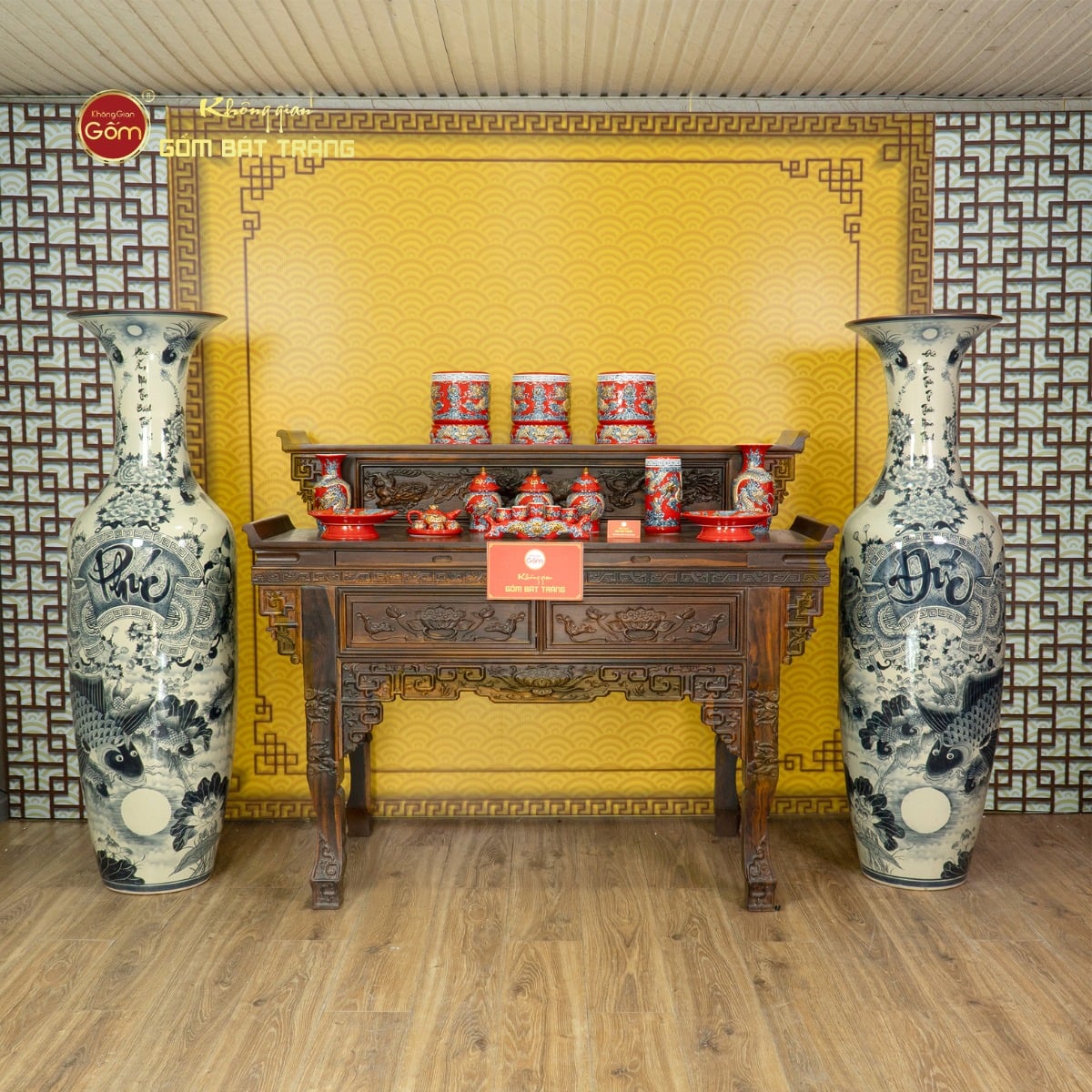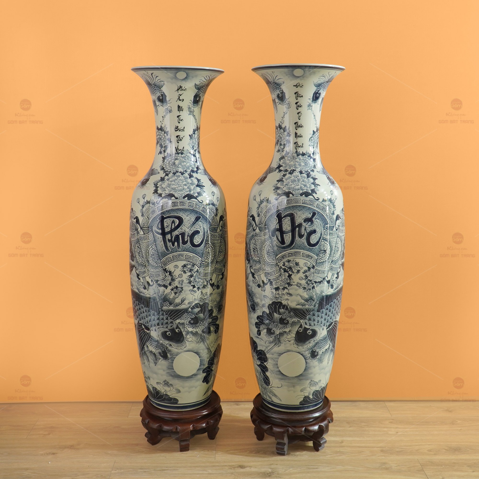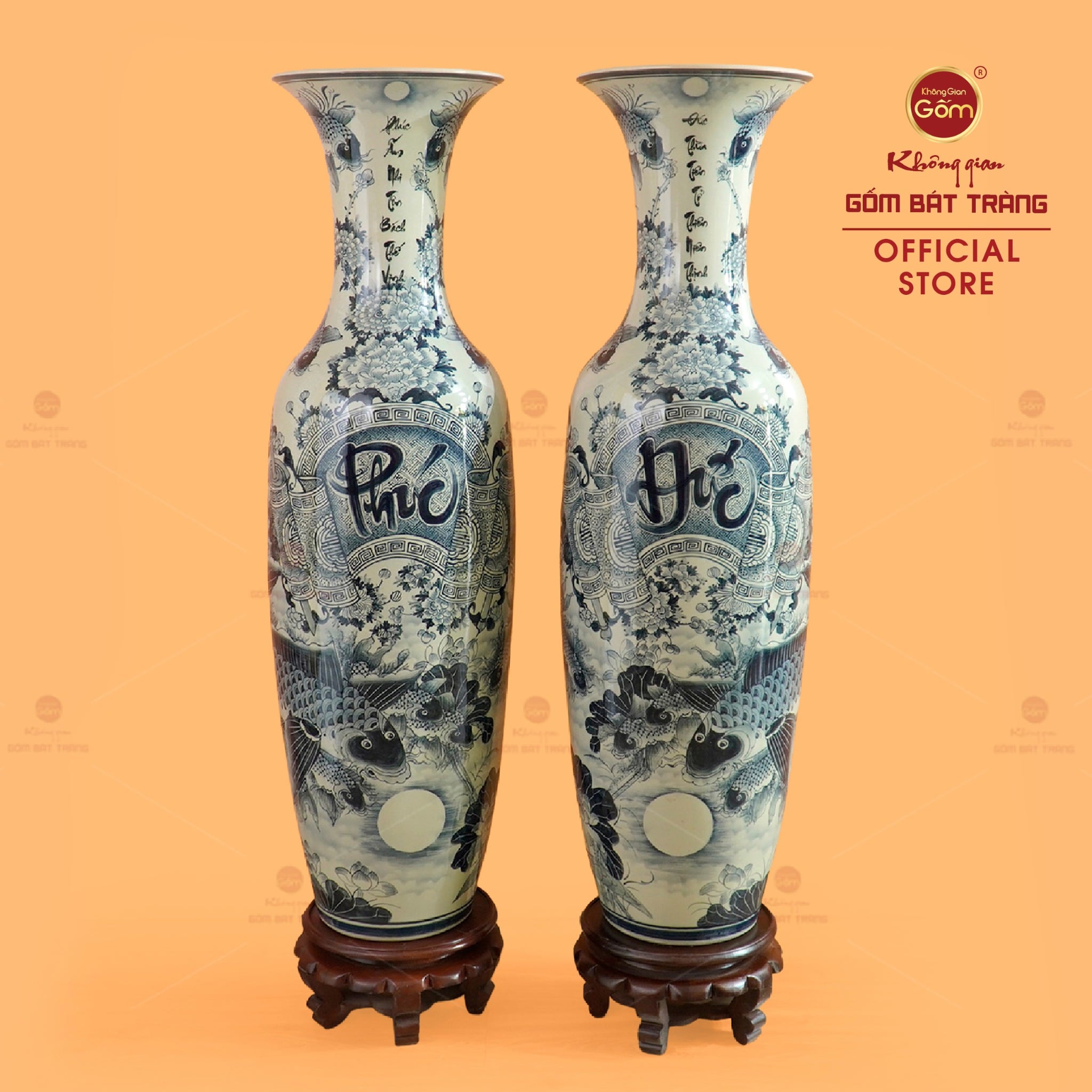 Điểm nhấn nổi bật đầu tiên của sản phẩm chính là kích thước 1M6 , tạo nên sự bề thế, uy nghi và vô cùng thu hút, lý tưởng cho các không gian rộng lớn như sảnh biệt thự, phòng khách cao trần hoặc nhà thờ tổ. Nổi bật trên thân bình cao lớn là hai chữ thư pháp “Phúc – Đức” được vẽ thủ công bằng tay với kỹ thuật Vẽ Kỹ đạt đến độ hoàn hảo. Khác với các dòng sản phẩm đại trà, nghệ thuật Vẽ Kỹ chú trọng vào độ mềm mại của nét bút, sự sắc nét của đường viền và kỹ thuật chấm phá tạo chiều sâu cho màu men.