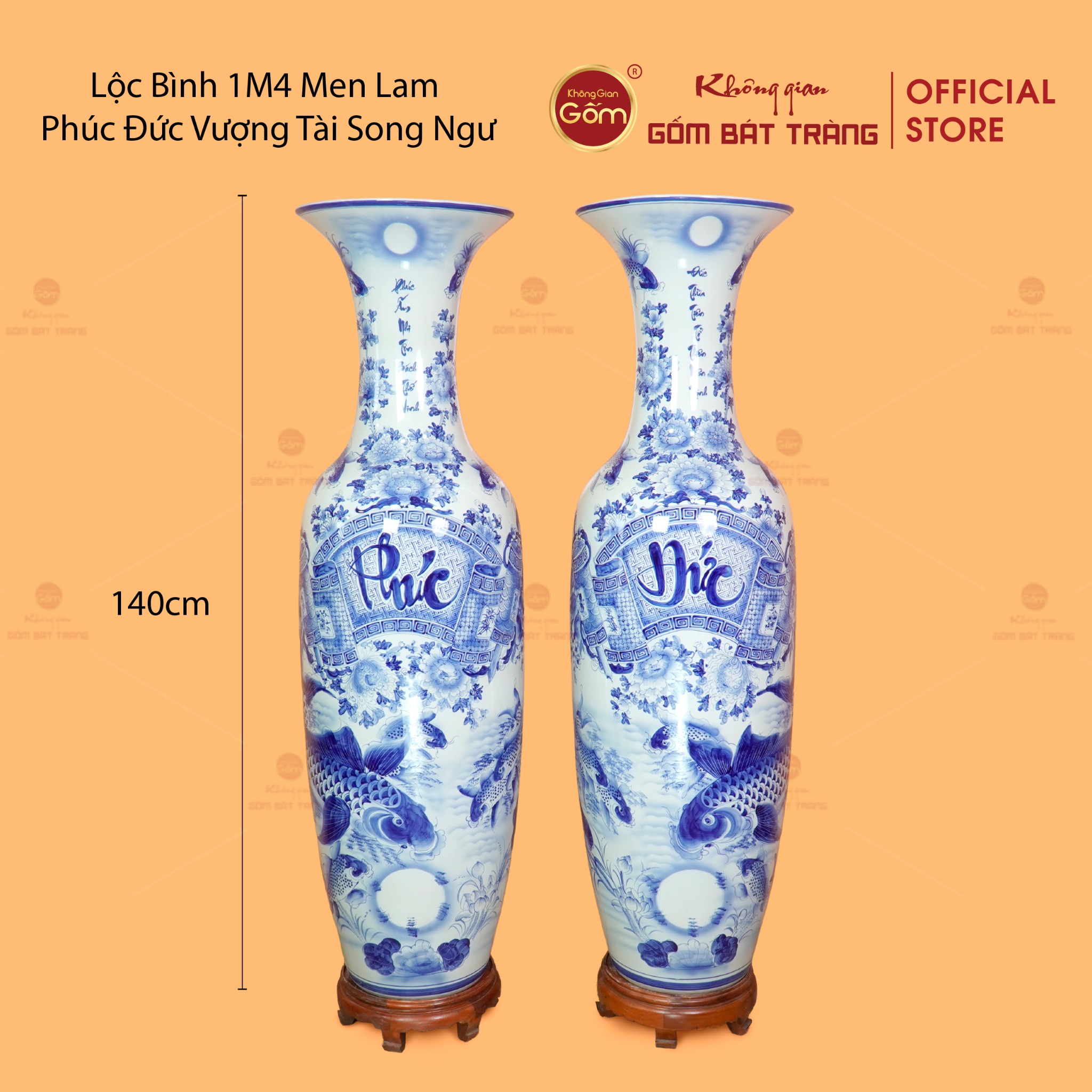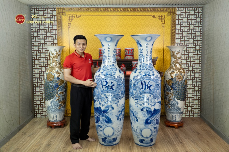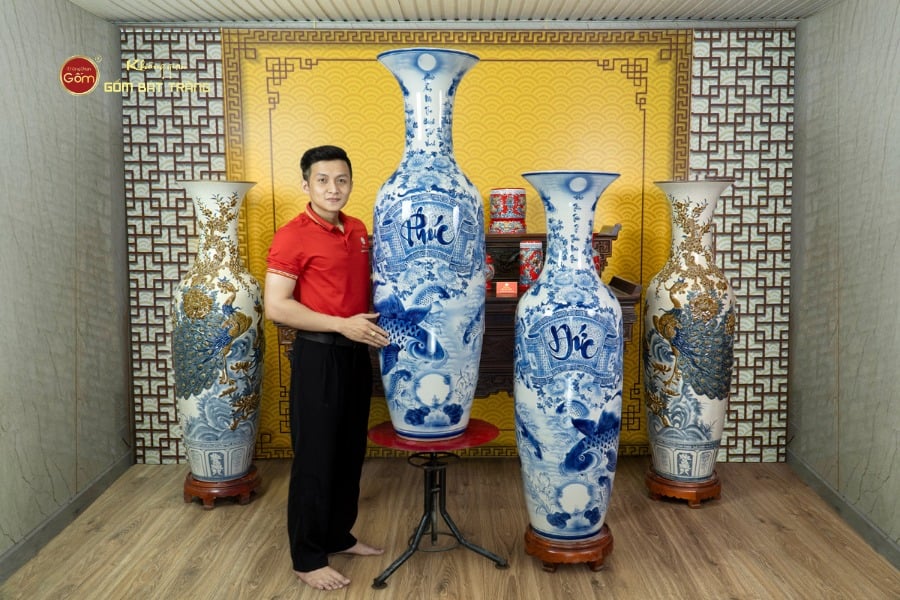 Lộc Bình 1m4 Men Lam Phúc Đức Vượng Tài Song Ngư