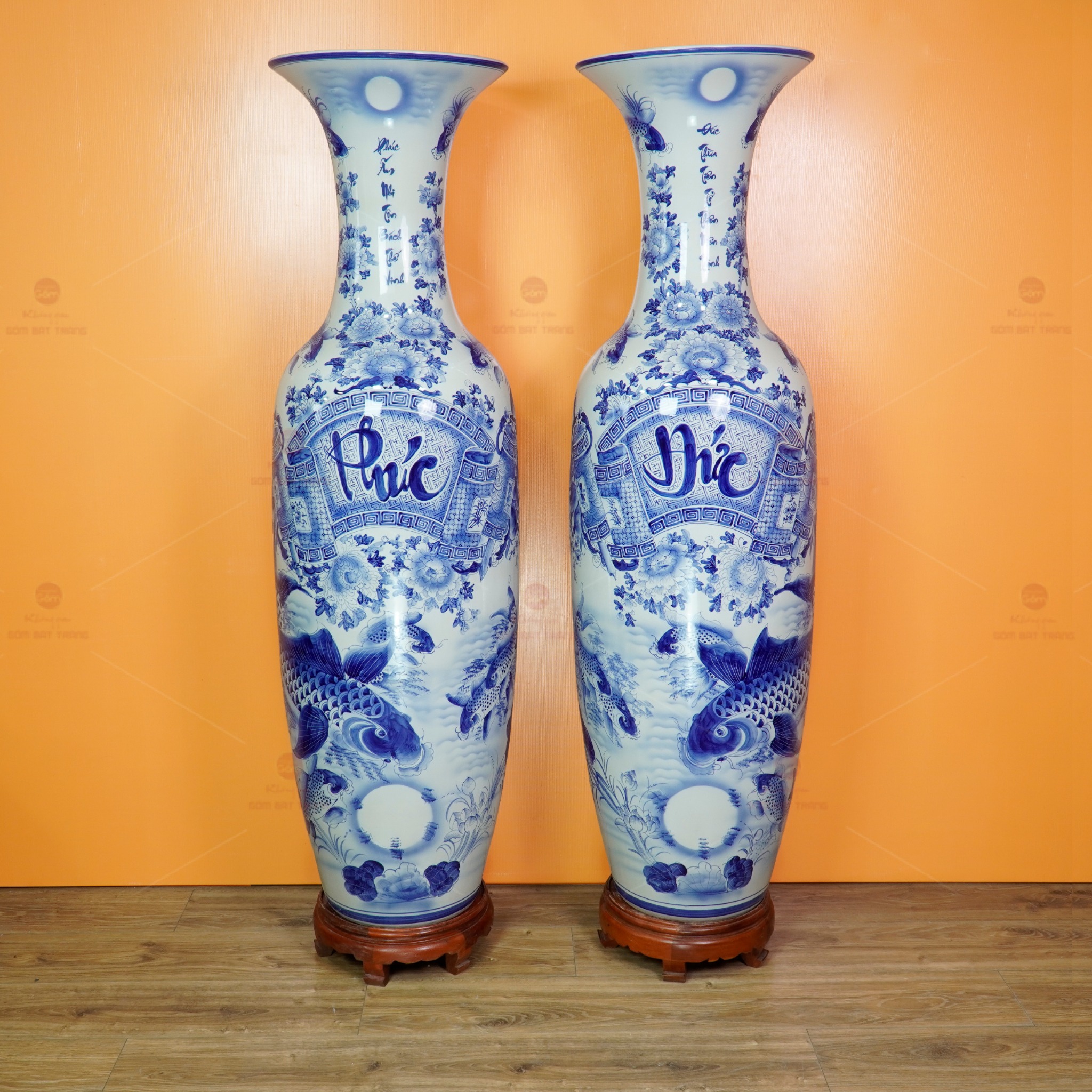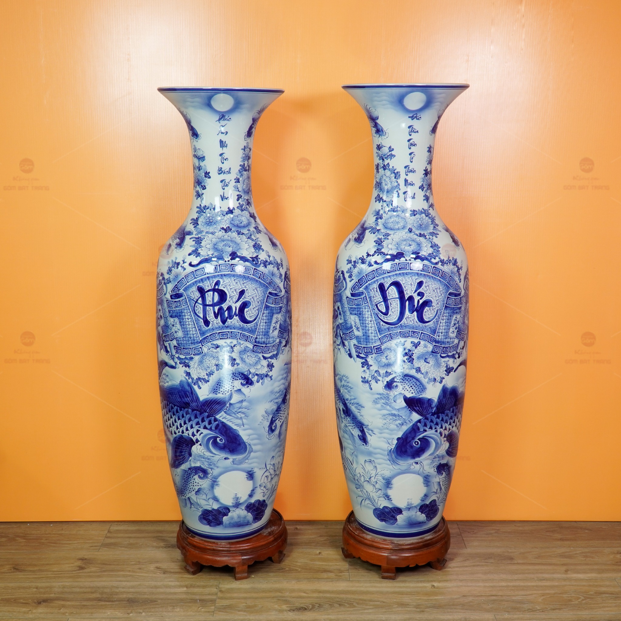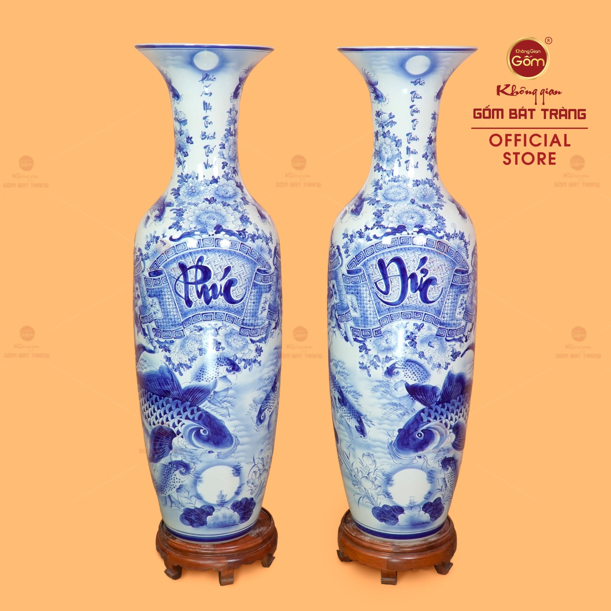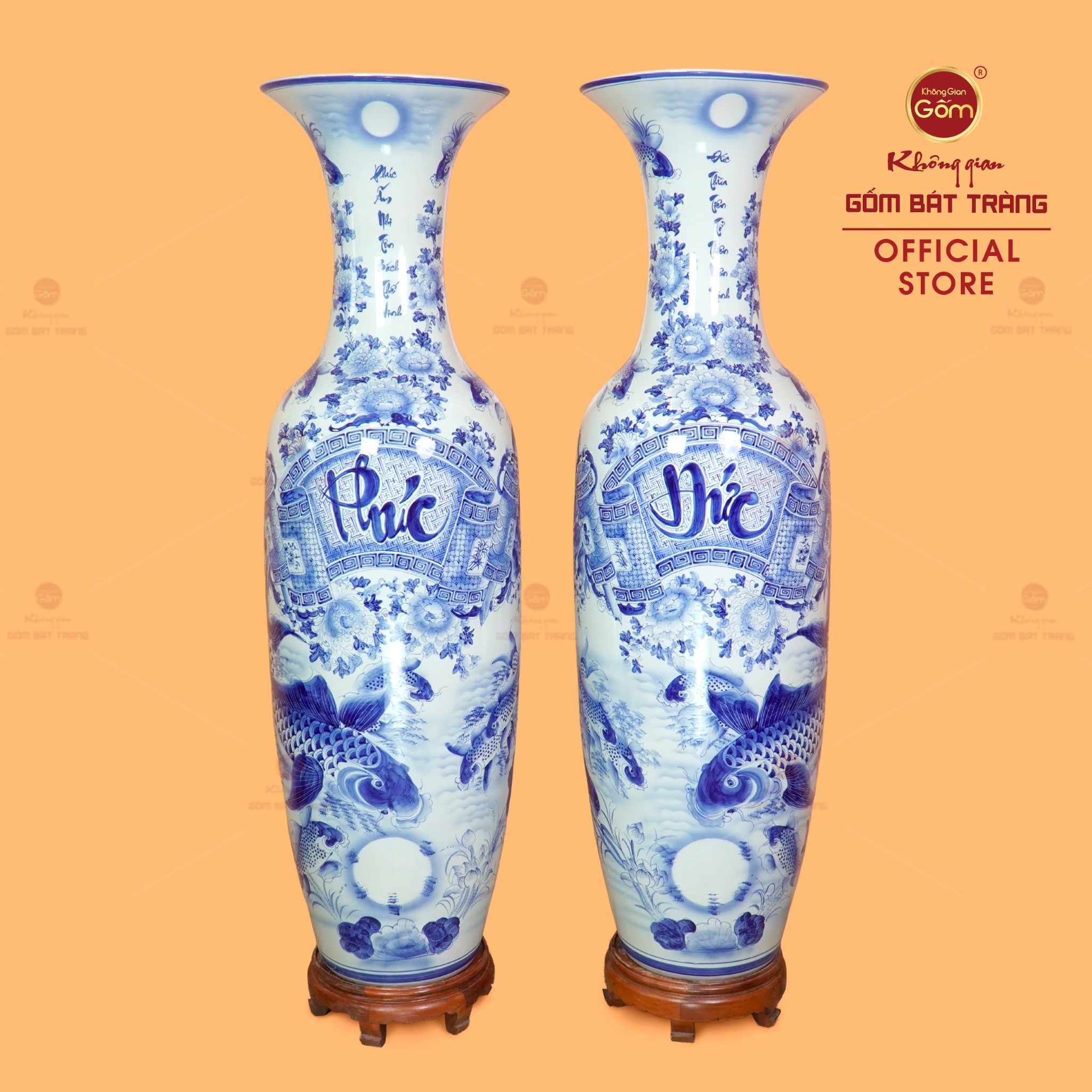 Lộc Bình 1m6 Men Lam Phúc Đức Vượng Tài Song Ngư